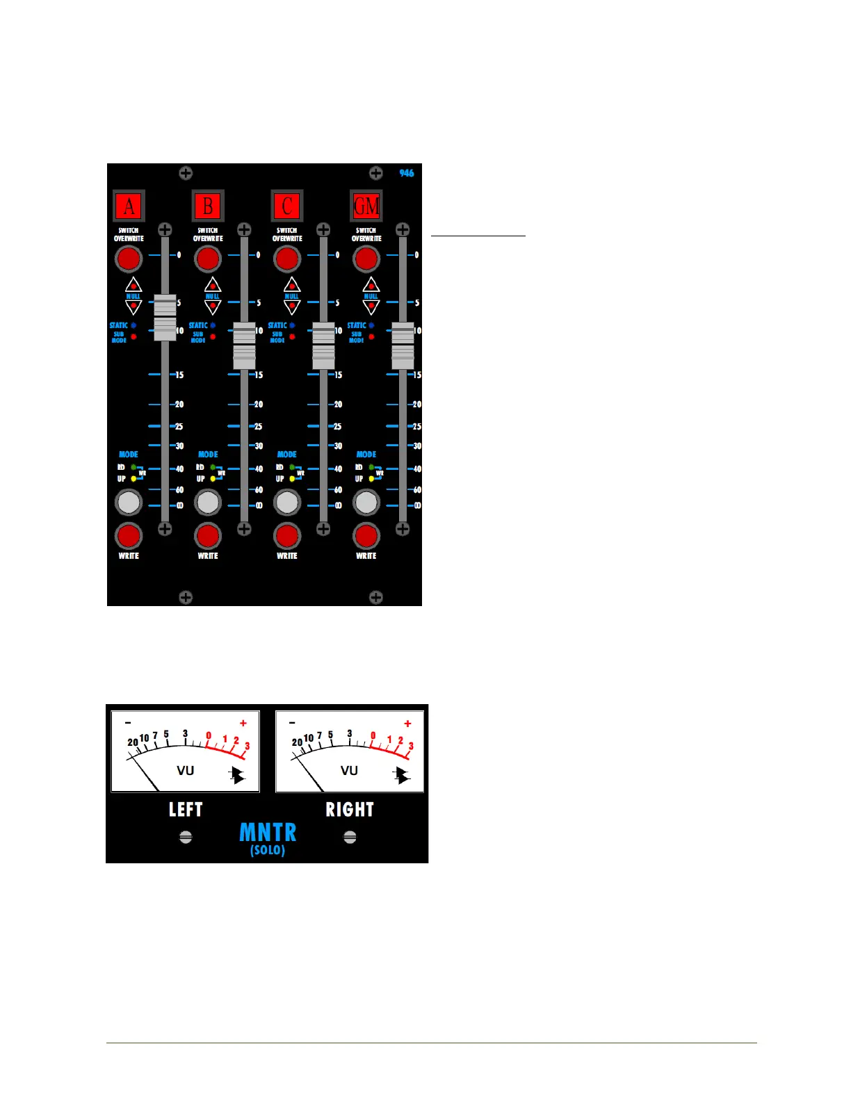 A pair of large, high-quality VU meters are installed in the top bay of the master bucket for indicating