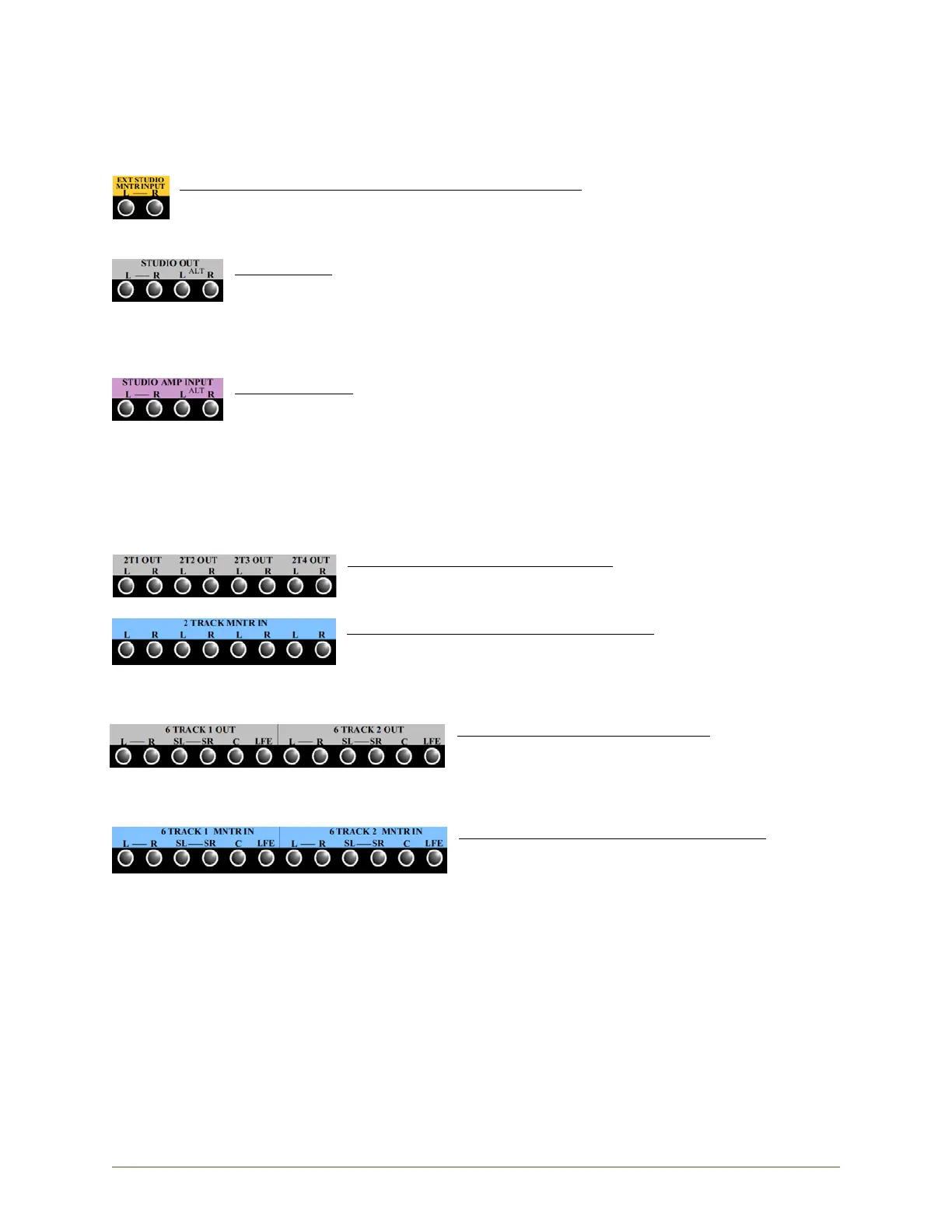 STUDIO AMP IN: Inputs to the main and alternate studio monitor amplifiers