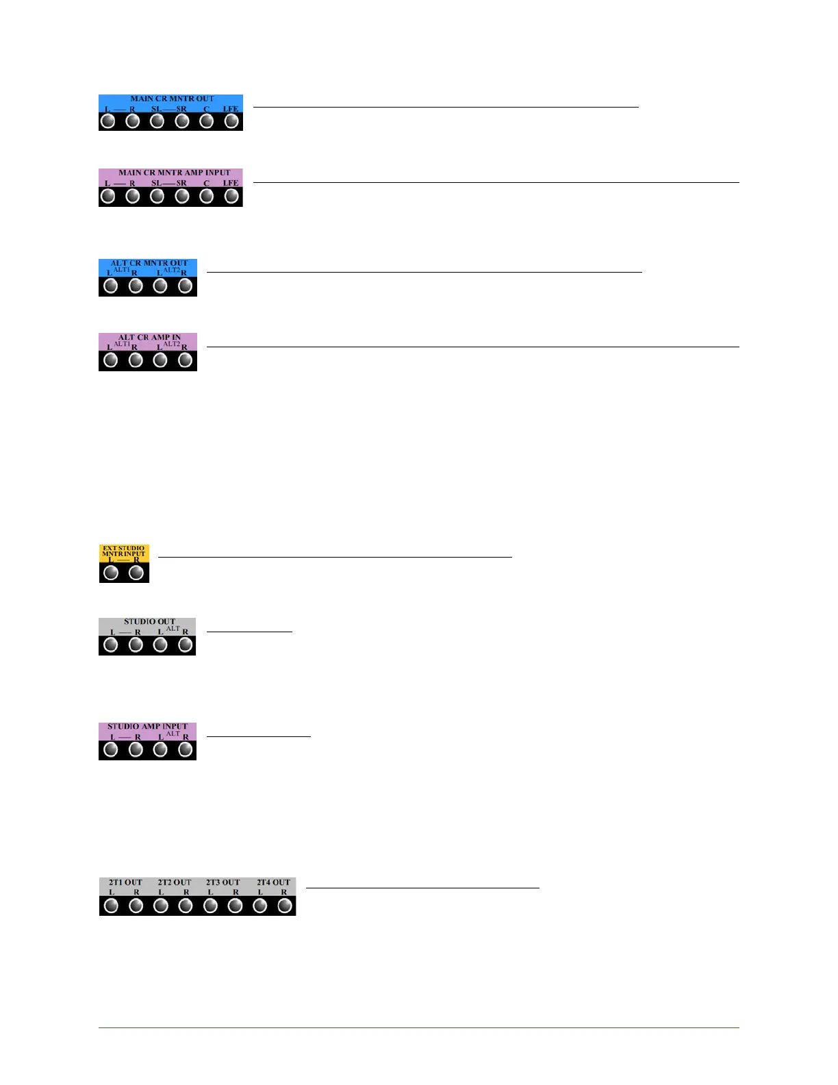 STUDIO AMP IN: Inputs to the main and alternate studio monitor amplifiers