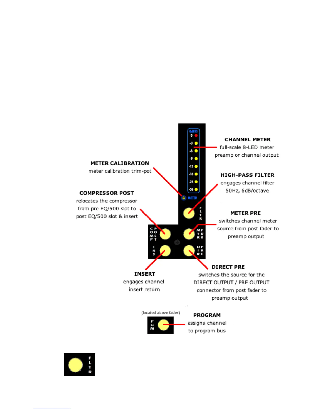 Input channels provide a 50Hz high-pass filter, an 8-segment LED full-scale meter,