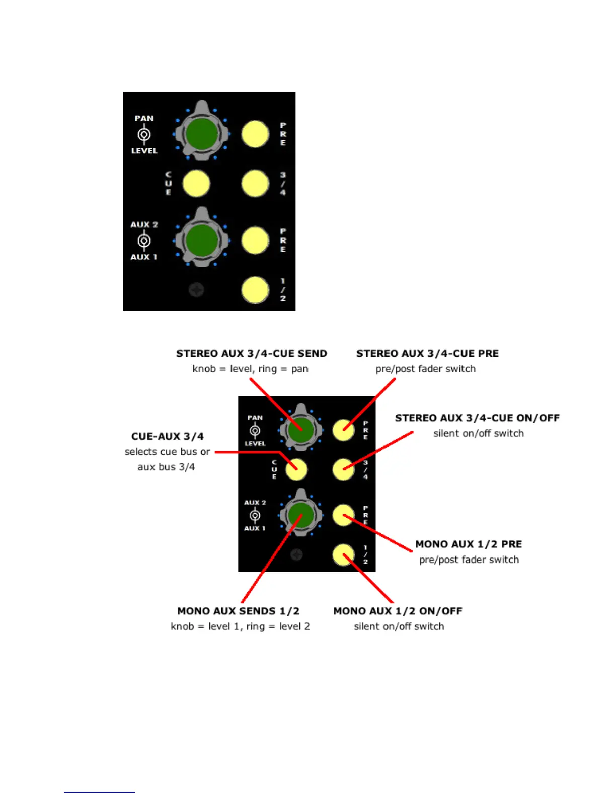 and an on/off switch. The stereo aux send (3/4)