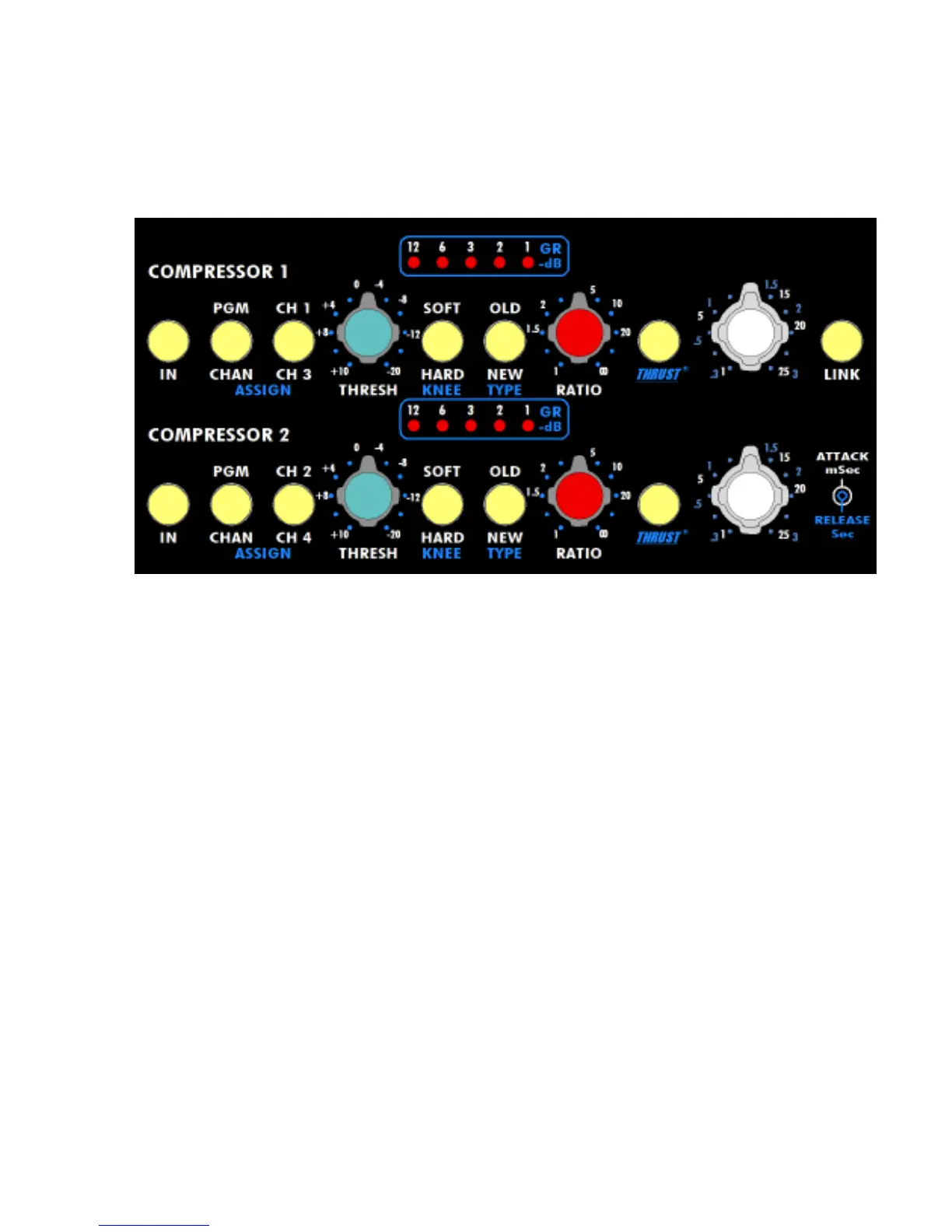 There is a "SOFT"/"HARD" KNEE switch for an "over-easy" type compression resulting in a