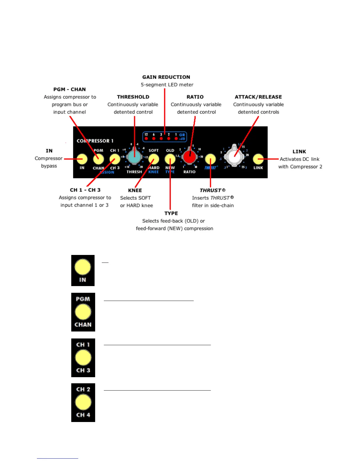 • Assigns the compressor to the selected input channel when engaged