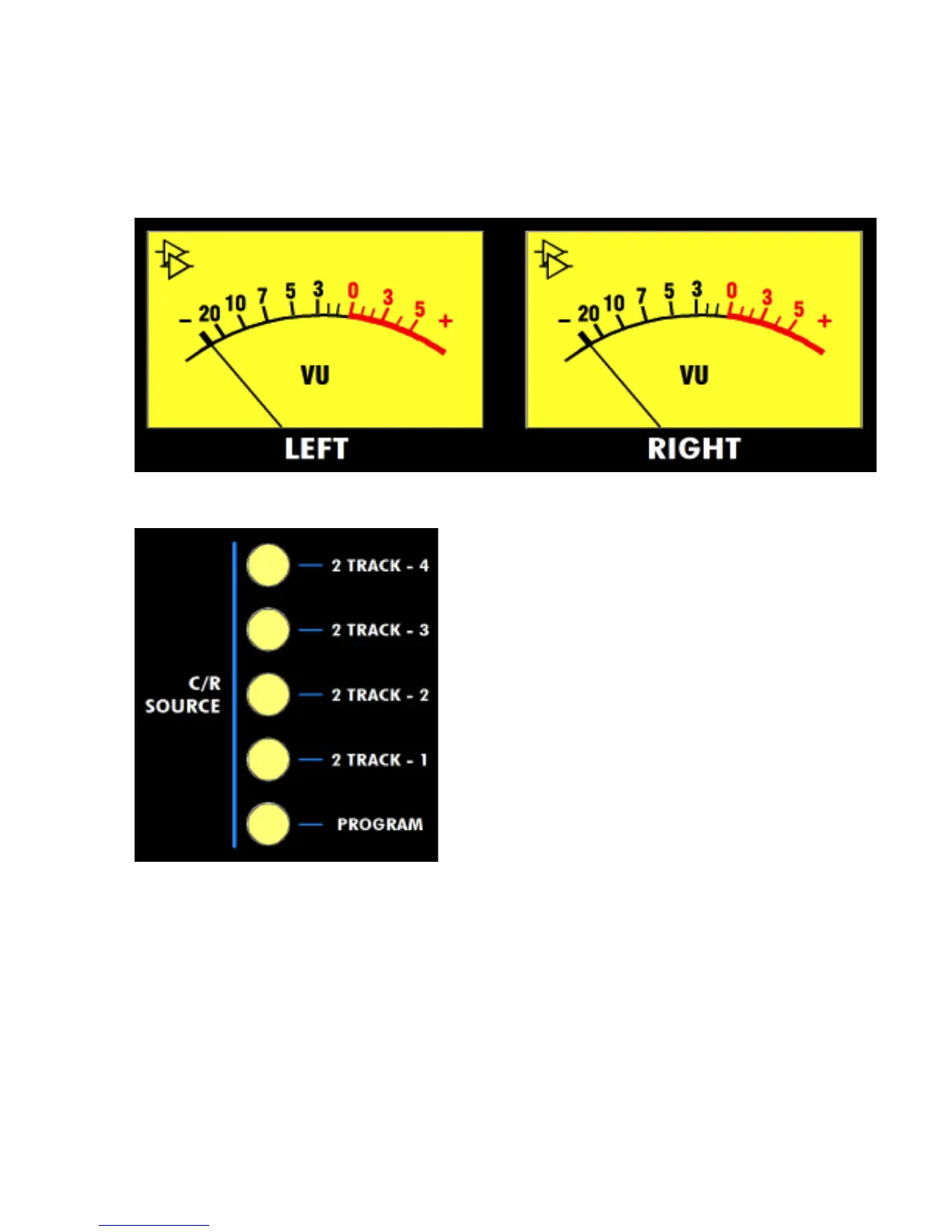 The meters are fed from the C/R SOURCE selectors above the control room monitors controls.