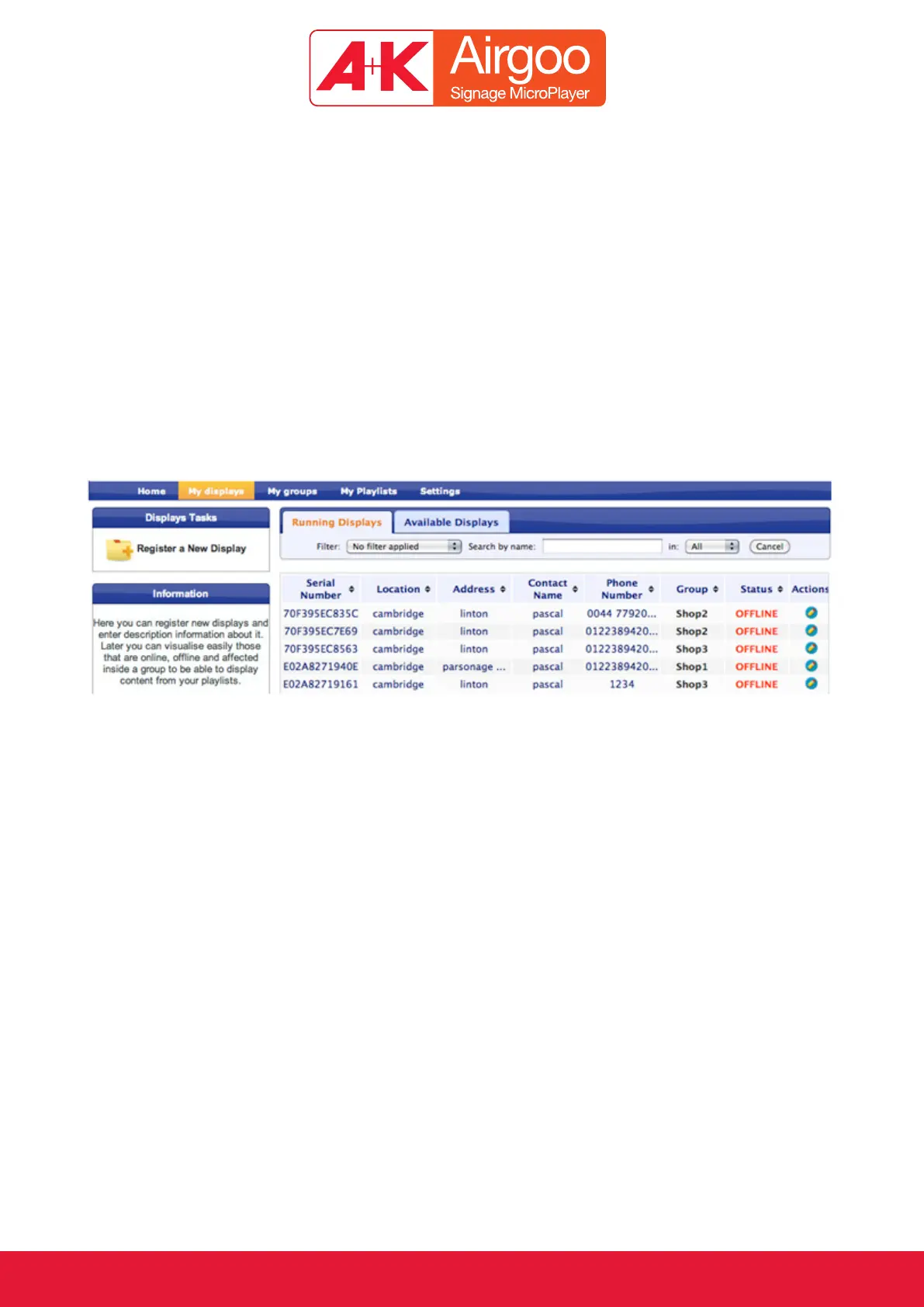 contact name and phone number. This will enable better management of the displays.