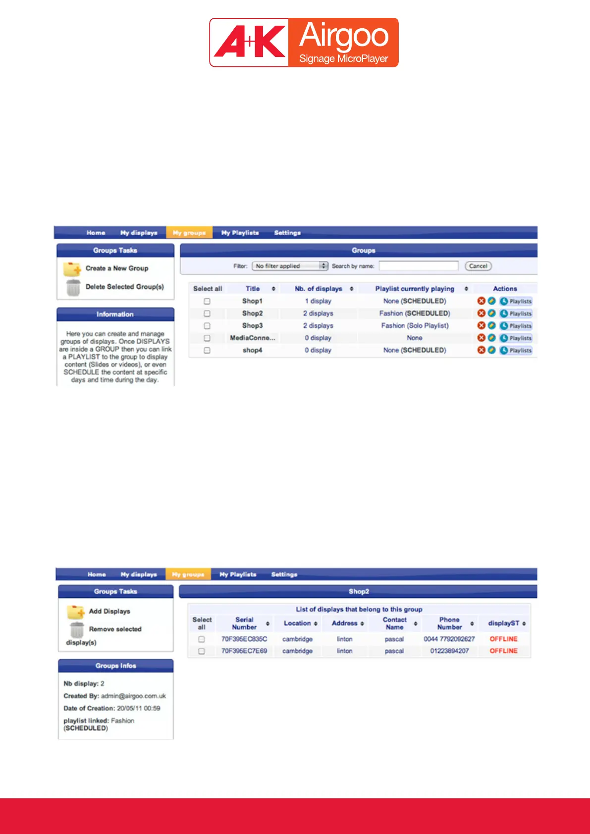 By clicking on one Group name we display the serial number of all the Displays within that Group.