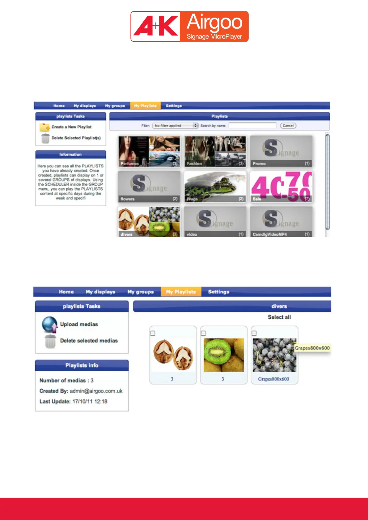 The first page in the “My Playlist” section lists all the pictures or videos contained in each Playlist;