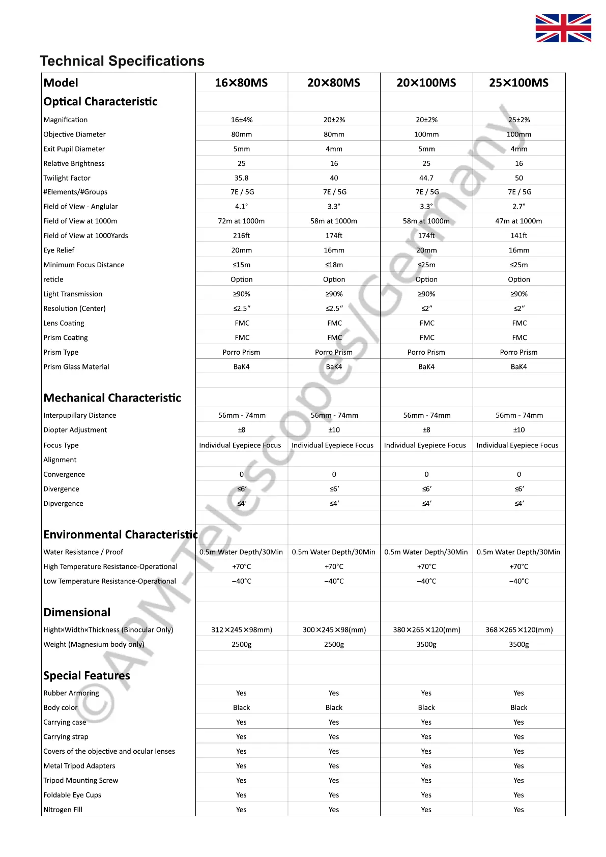 APM MS Series - Technical Specifications; Optical Characteristics; Mechanical Characteristics; Environmental Characteristics