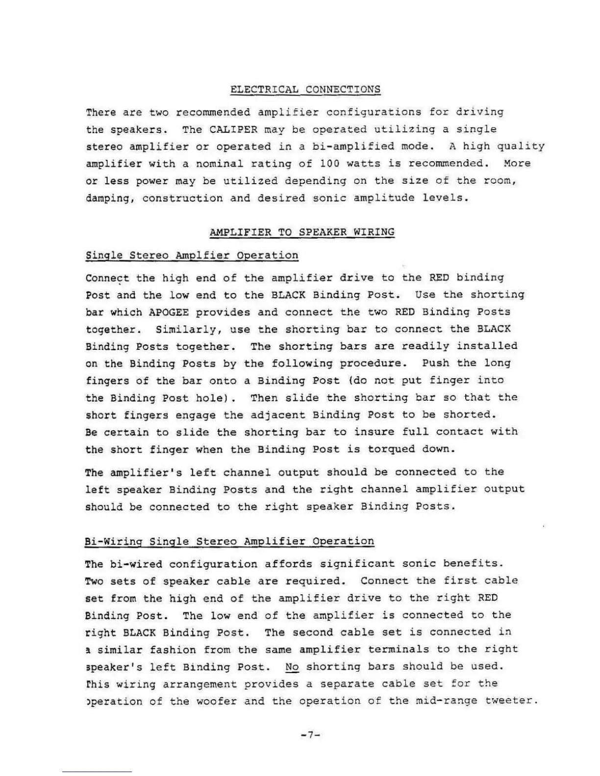 Apogee Acoustics Caliper - Electrical Connections; Amplifier to Speaker Wiring; Single Stereo Amplifier Operation; Bi-Wiring Stereo Operation