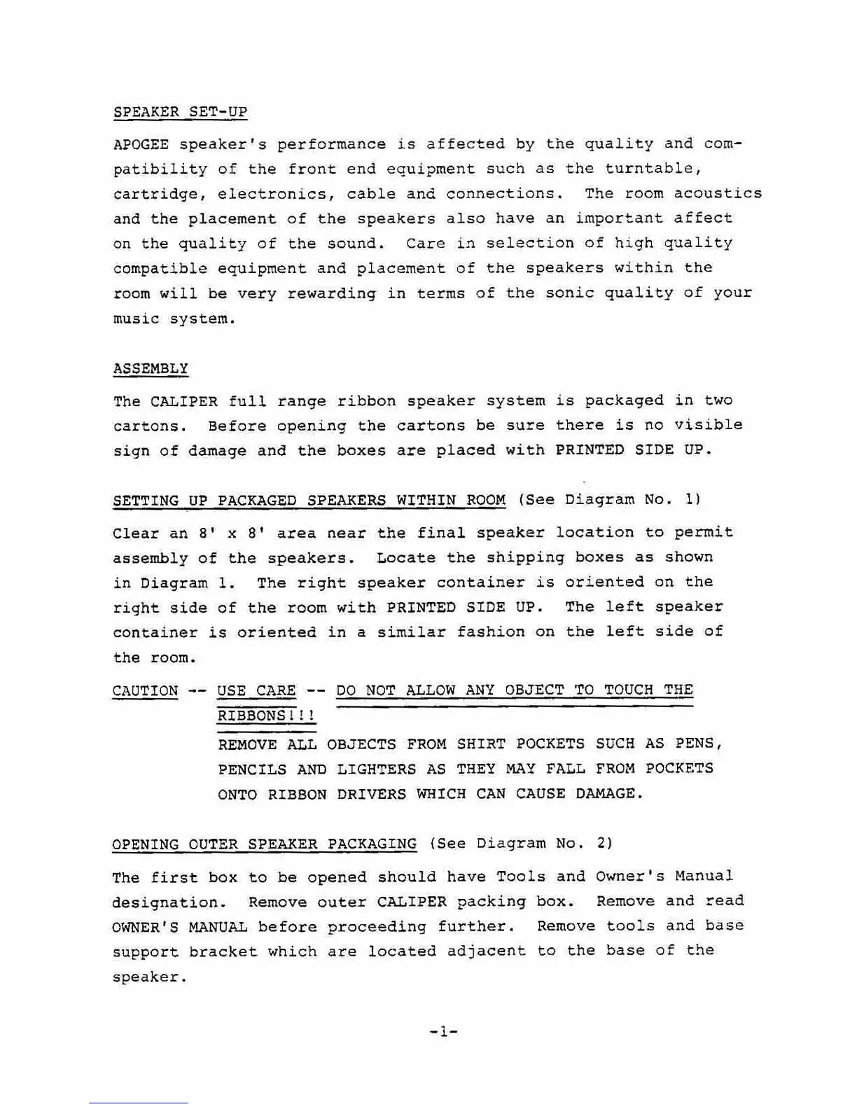 Apogee Acoustics Caliper - Setup and Assembly; Setting Up Packaged Speakers; Opening Speaker Packaging