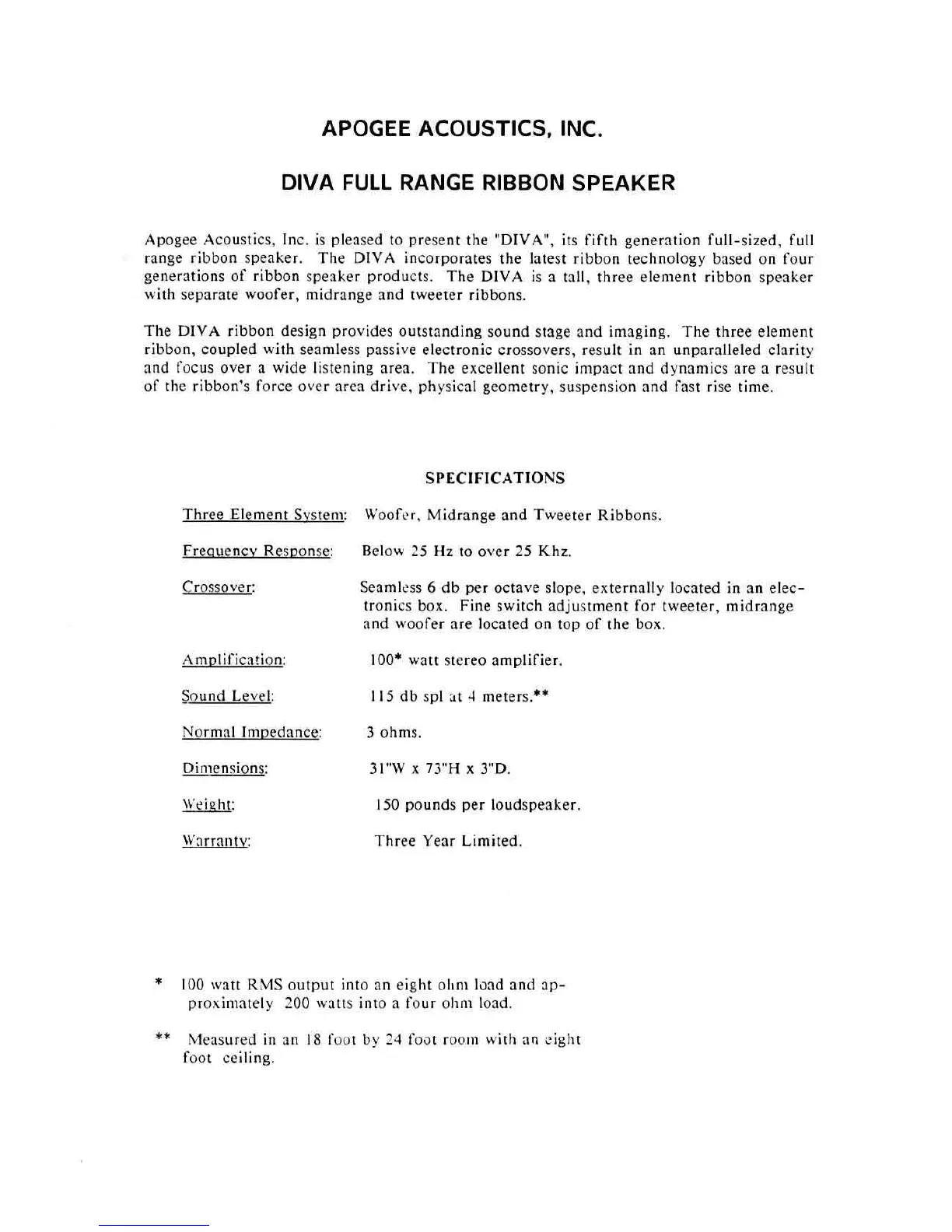 Apogee Acoustics Diva - DIVA SPEAKER INTRODUCTION AND SPECIFICATIONS; SPECIFICATIONS