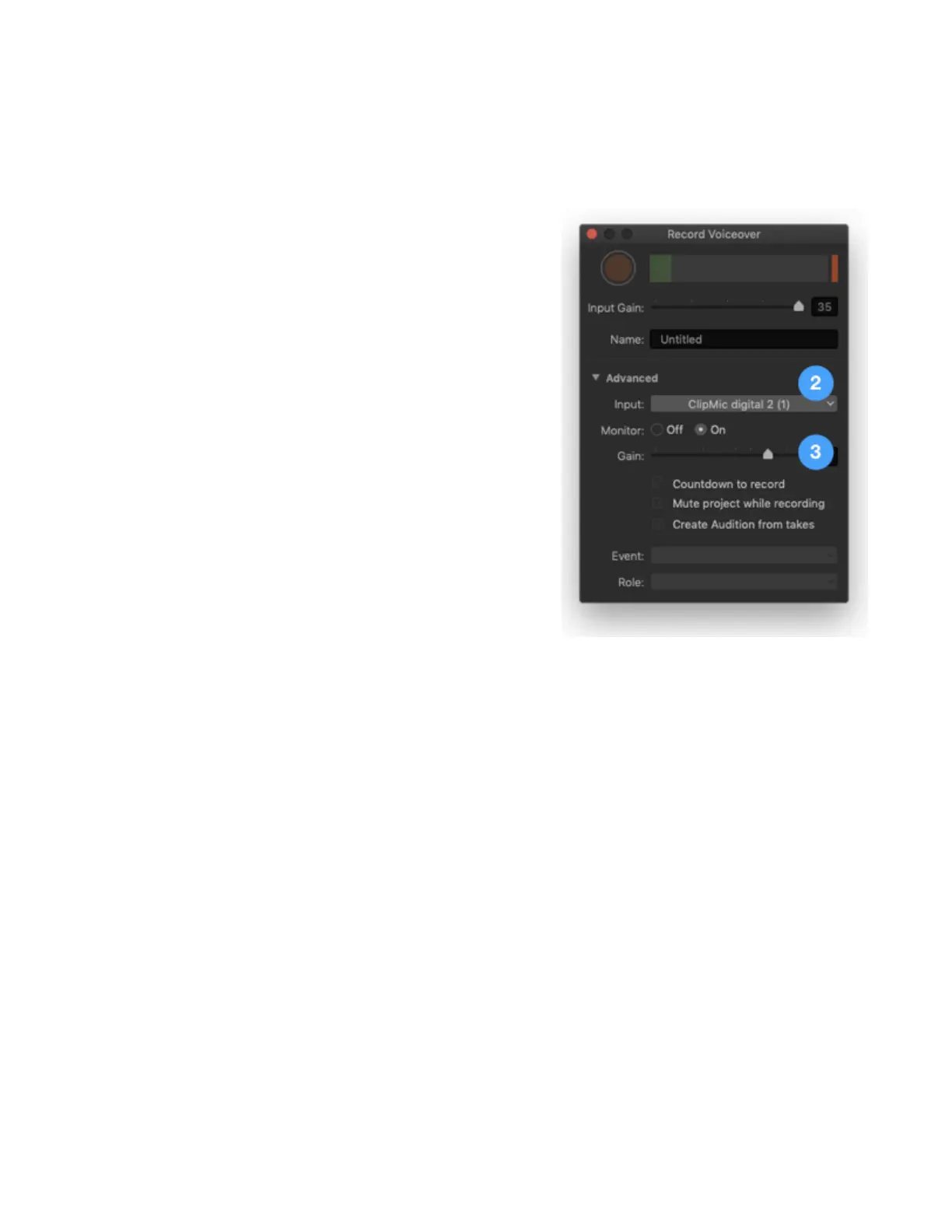2. In the Record Voiceover window, open the Advanced