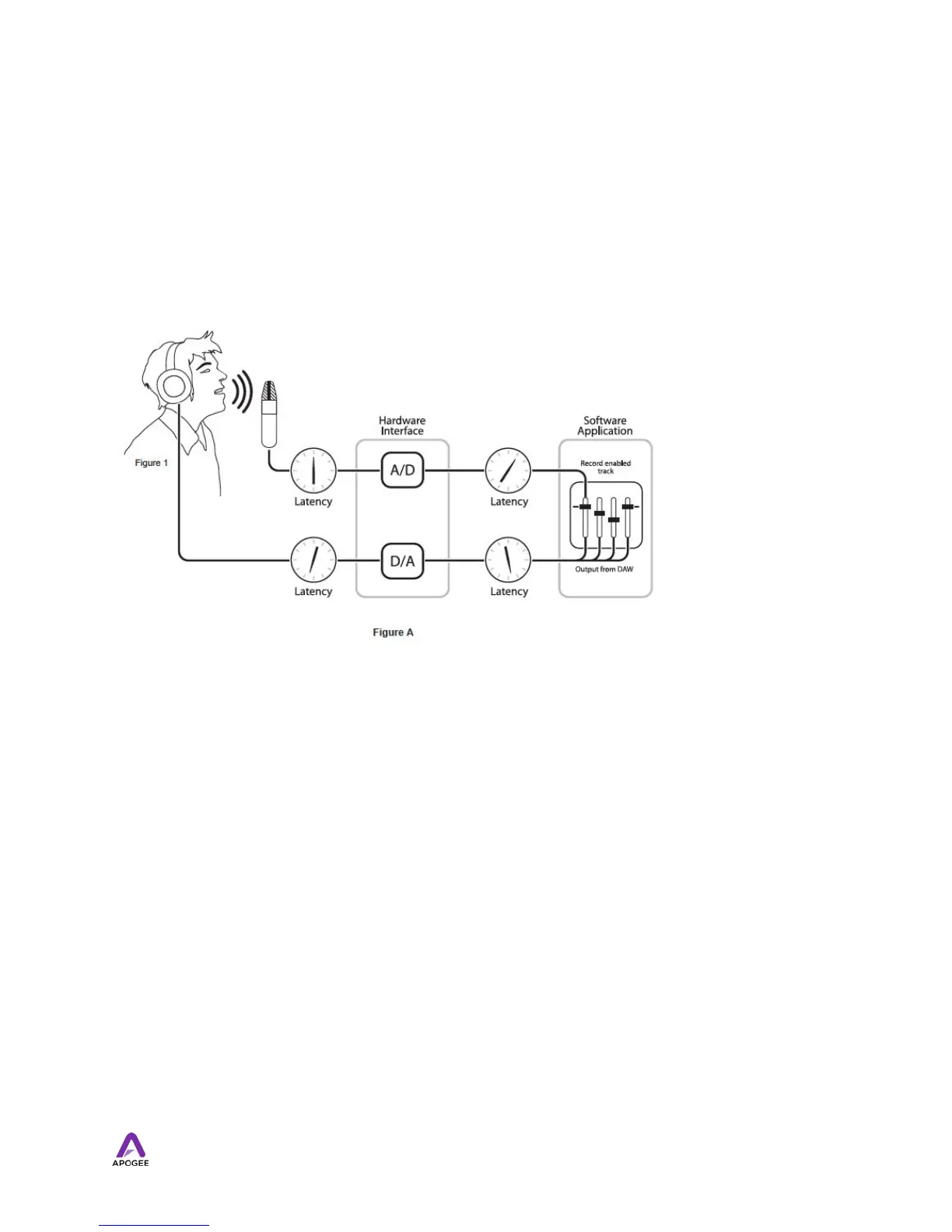 To illustrate the effect of latency, figure A depicts the typical signal path of a vocal overdub