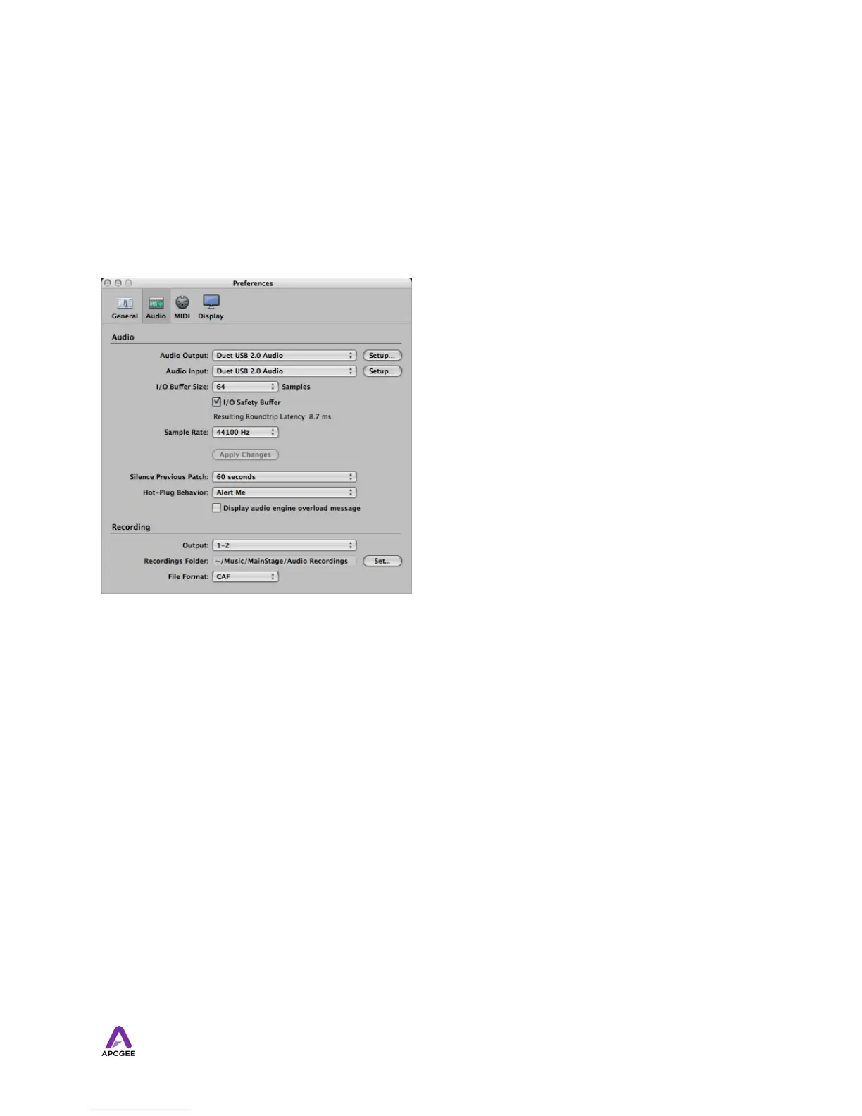 Warning! Apogee's Control Panel within MainStage is not compatible with Duet 2