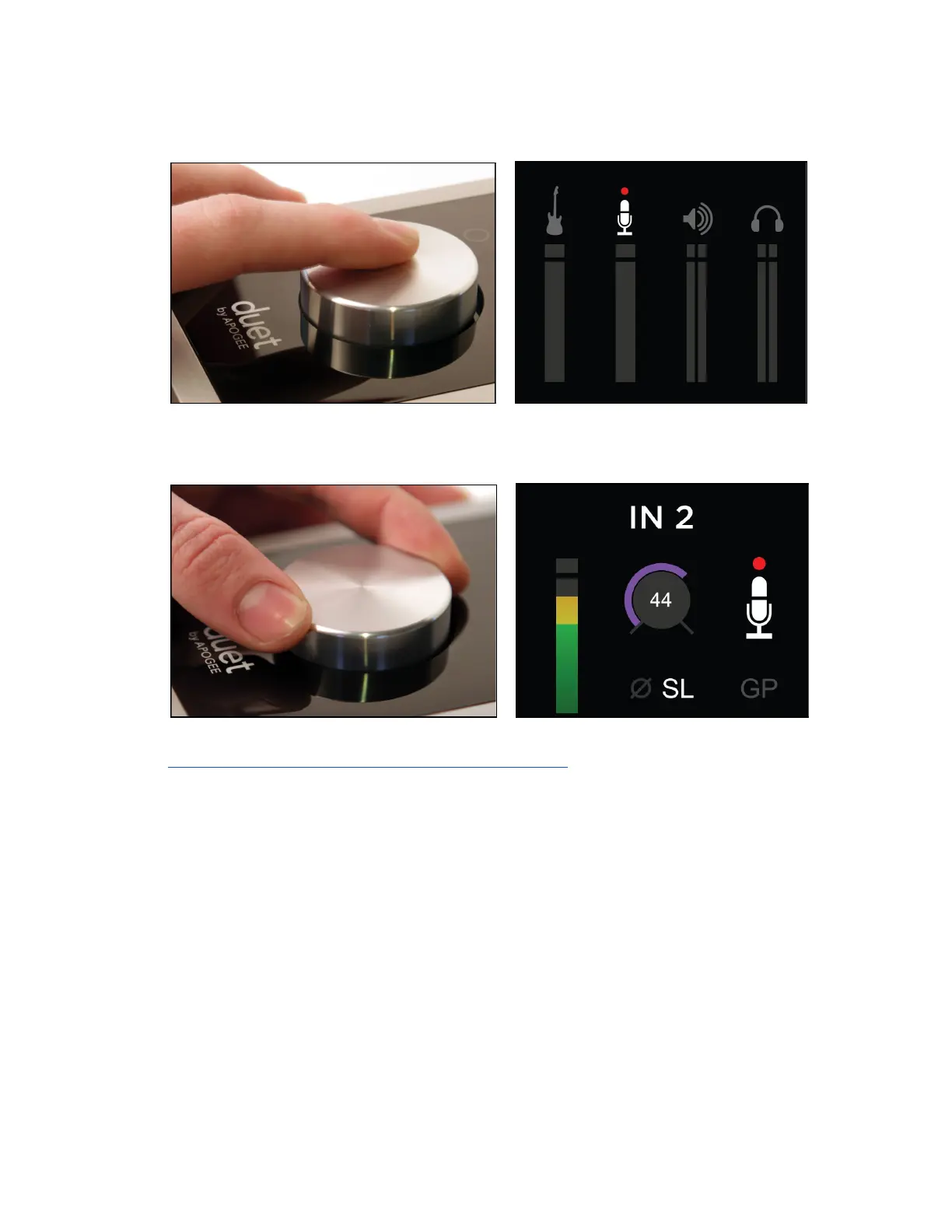 3. To adjust the input gain level, press Duet’s Multi-function Controller Knob until either the