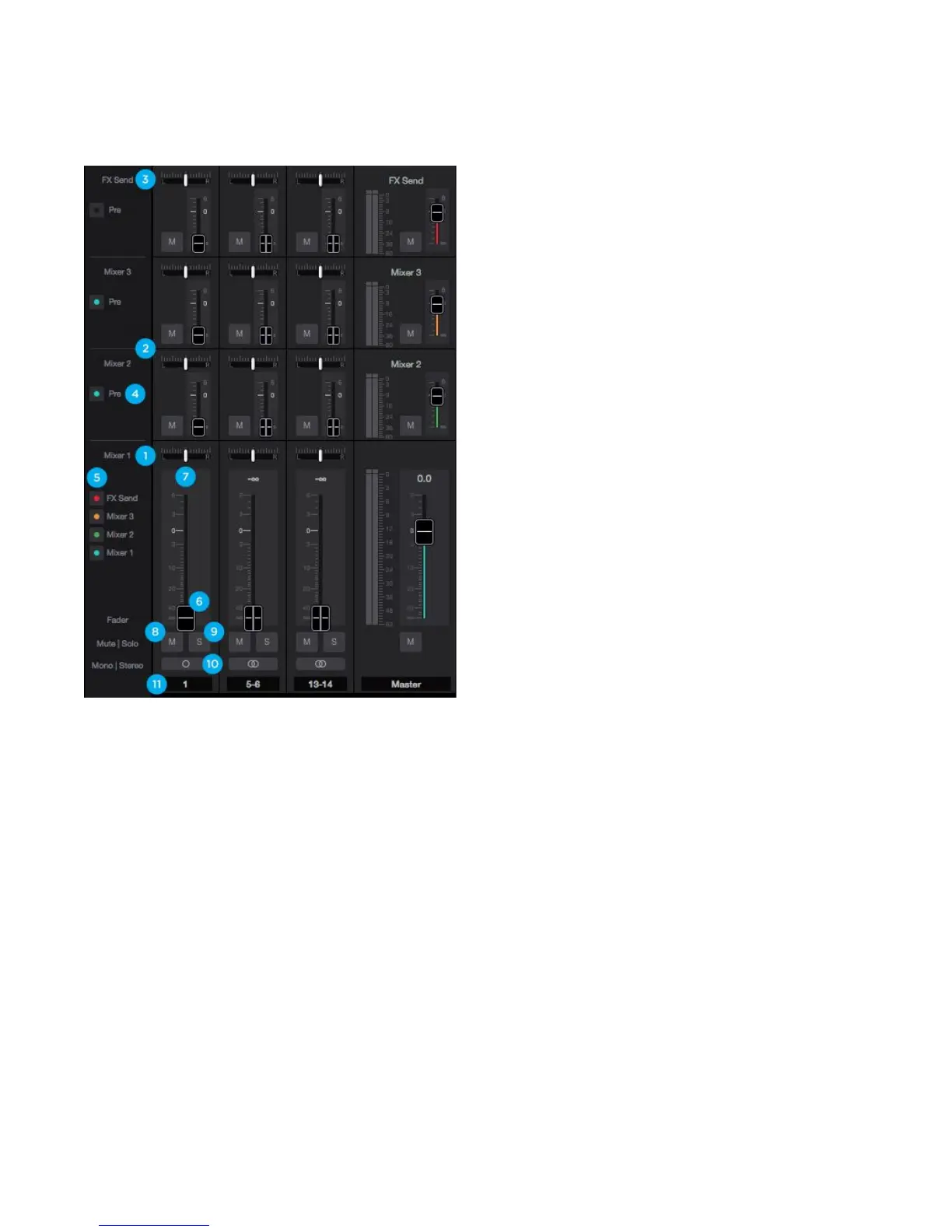 6. Channel Fader - Set the level of the channel signal in the mixer master stereo output.