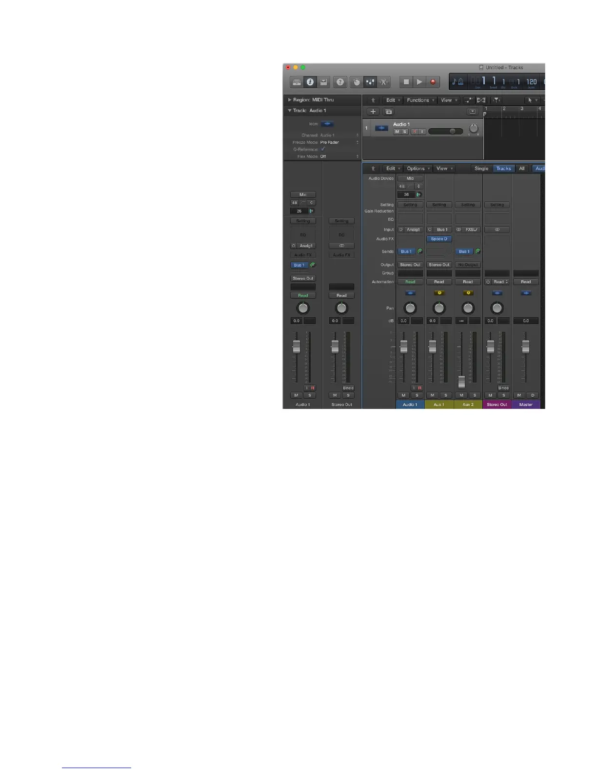 This Audio playback track and Reverb Aux track is mixed in Logic’s Mixer and sent to the Stereo Out, where it arrives in
