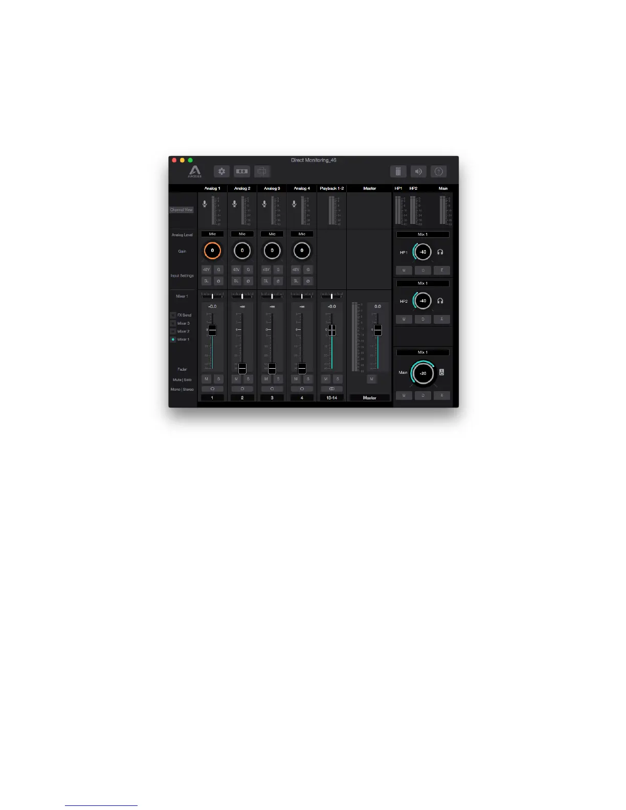 ● Mixer 1 Showing - Mixer 1 is the key to direct monitoring and is used to send signal from the various channels