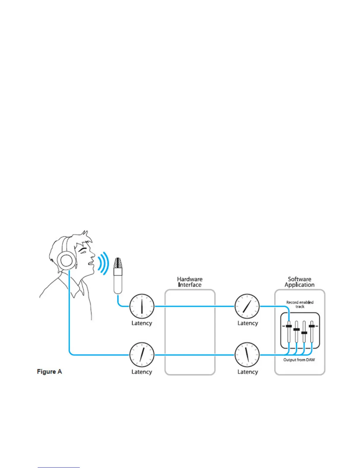 To illustrate the eect of latency, Figure A depicts the typical signal path of a vocal overdub session. A vocalist