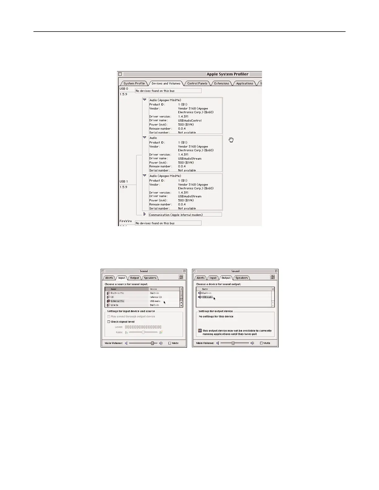 tab. The Mini•Me should show up labeled “Apogee” as one of the USB devices.