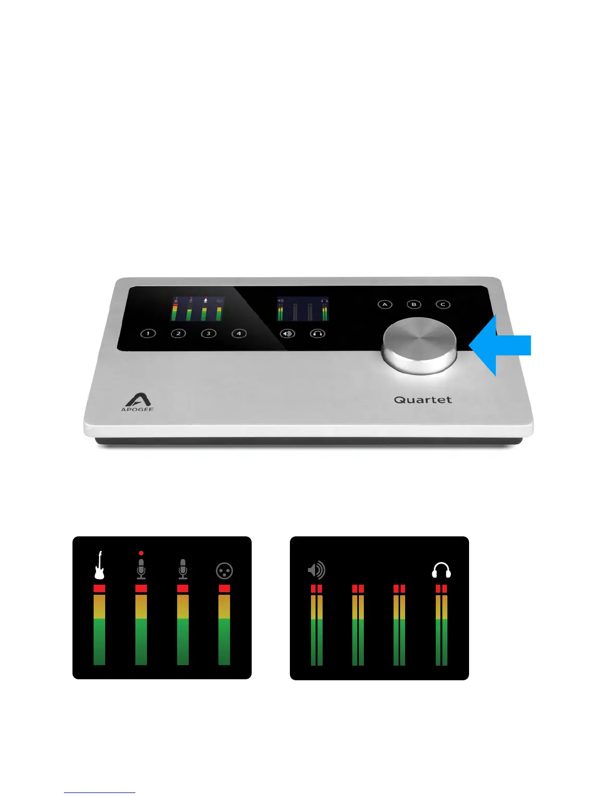 Quartet’s Controller Knob allows you to easily adjust the levels of all inputs and outputs and also