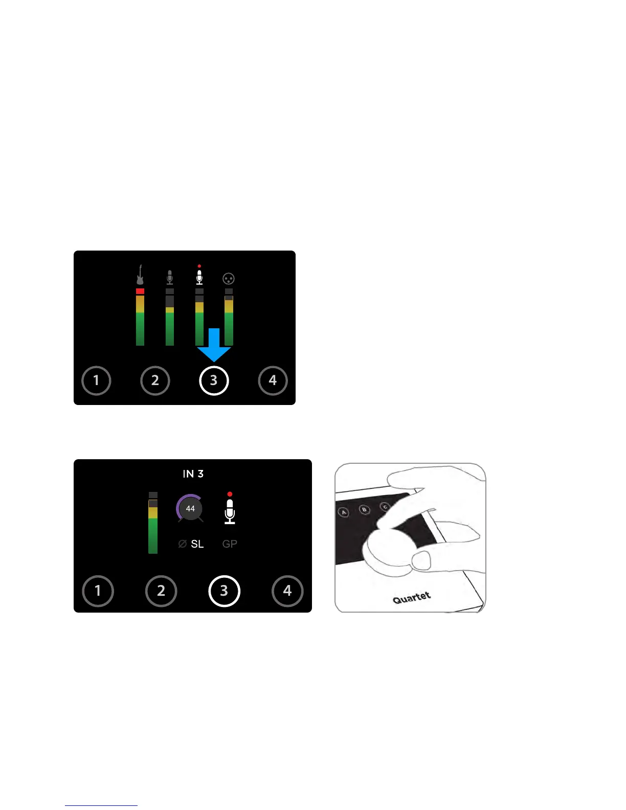 To change Quartet’s input level (i.e the preamp gain of microphones and instruments):