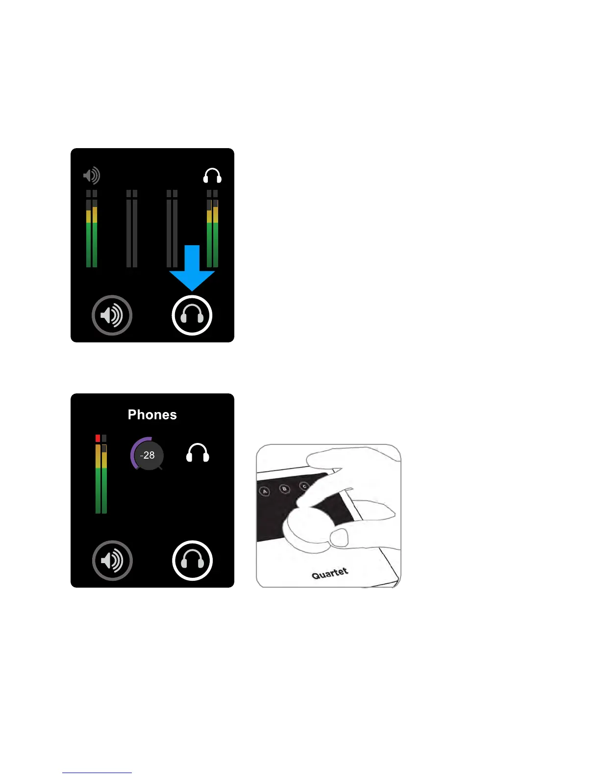 To change Quartet’s headphone output level (i.e the listening level of connected headphones):