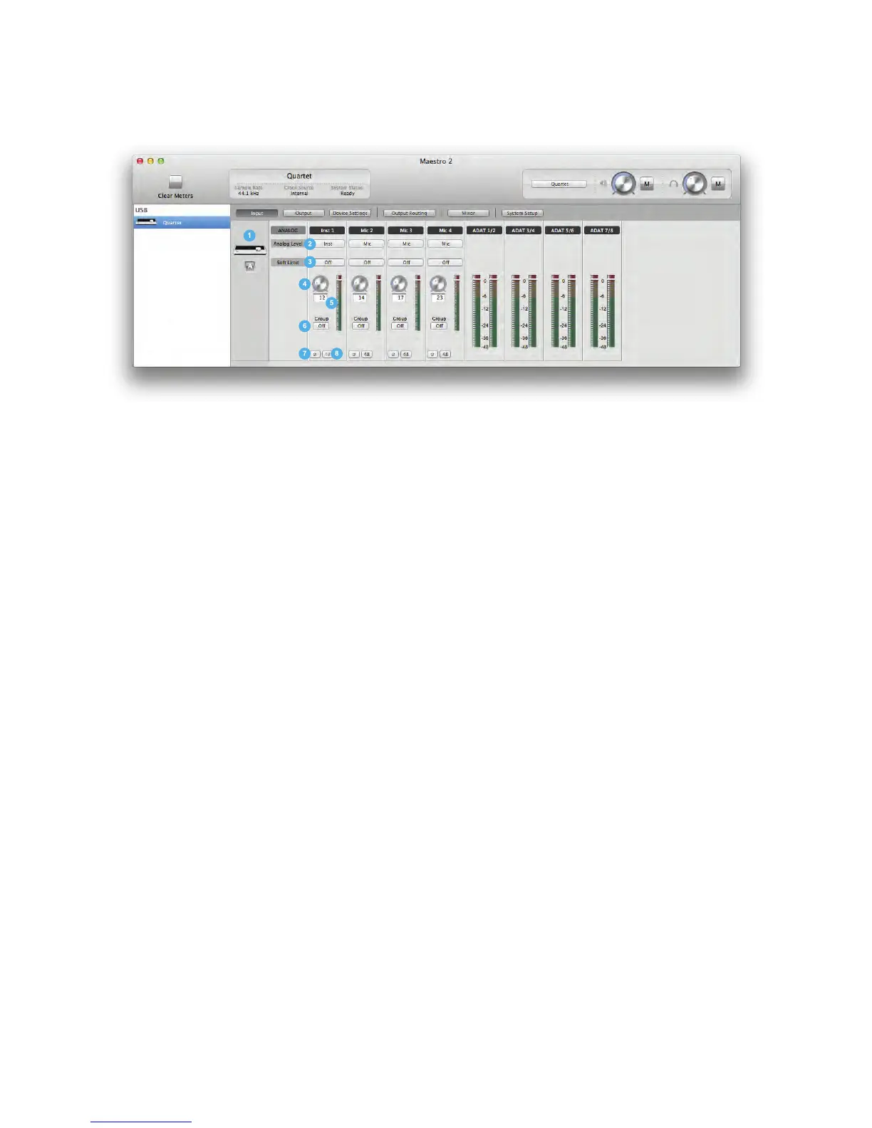 4. Input Level - The gain of each input is controlled with these software knobs. The gain level is