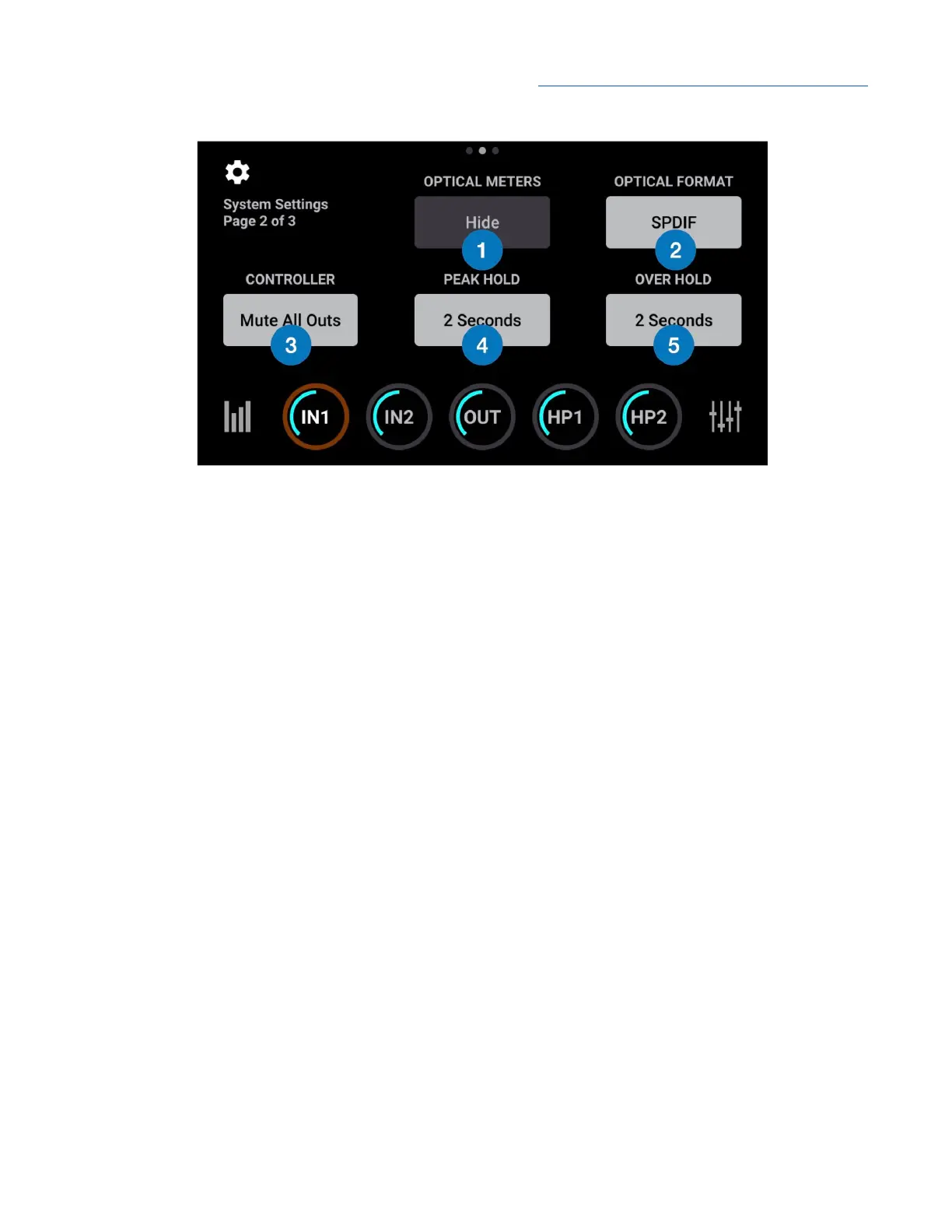 5. Over Hold - tap to set the time* that over indicators are held on the level meters.