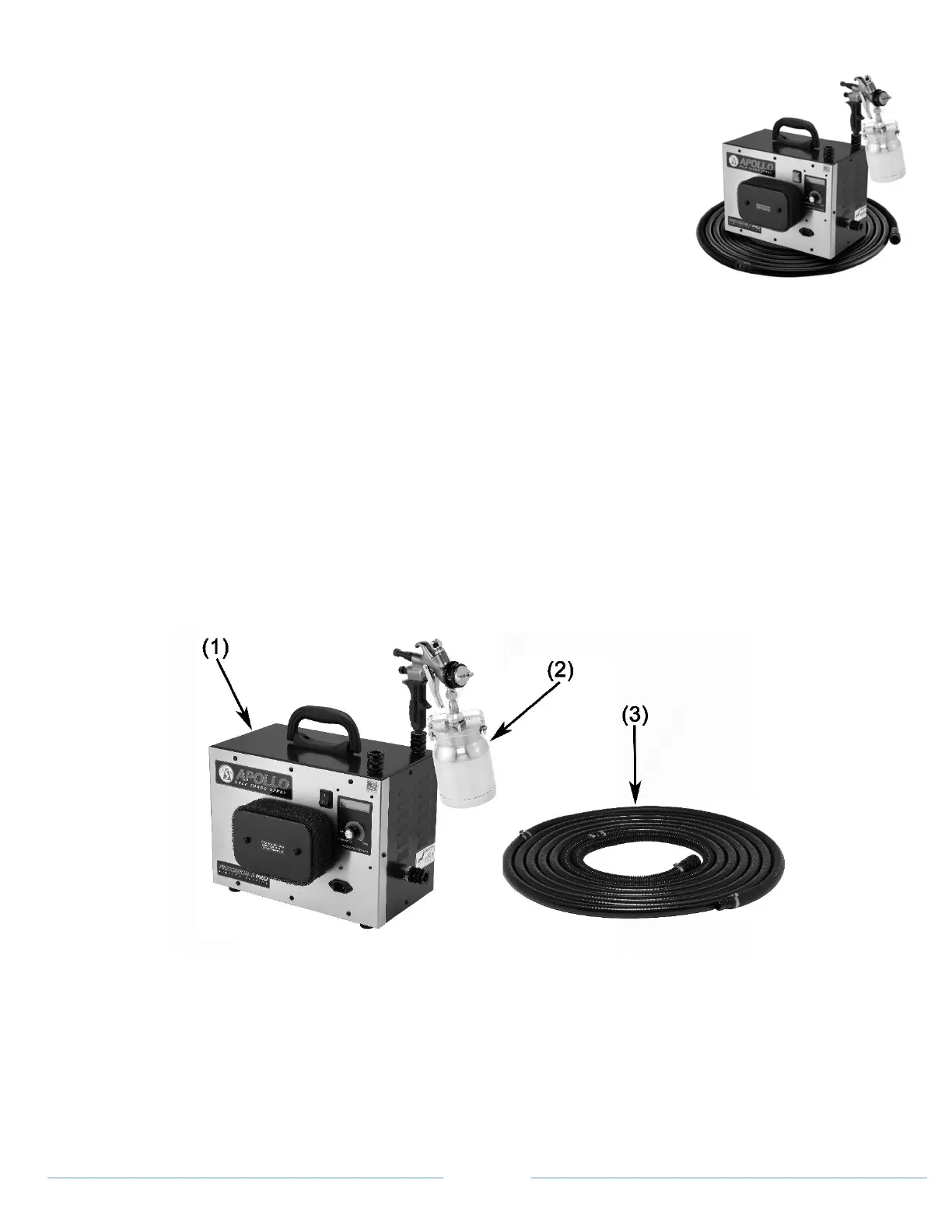 Your turbine system has three components: the turbine unit (1), spray gun (2) and air hose (3). The turbine unit, when