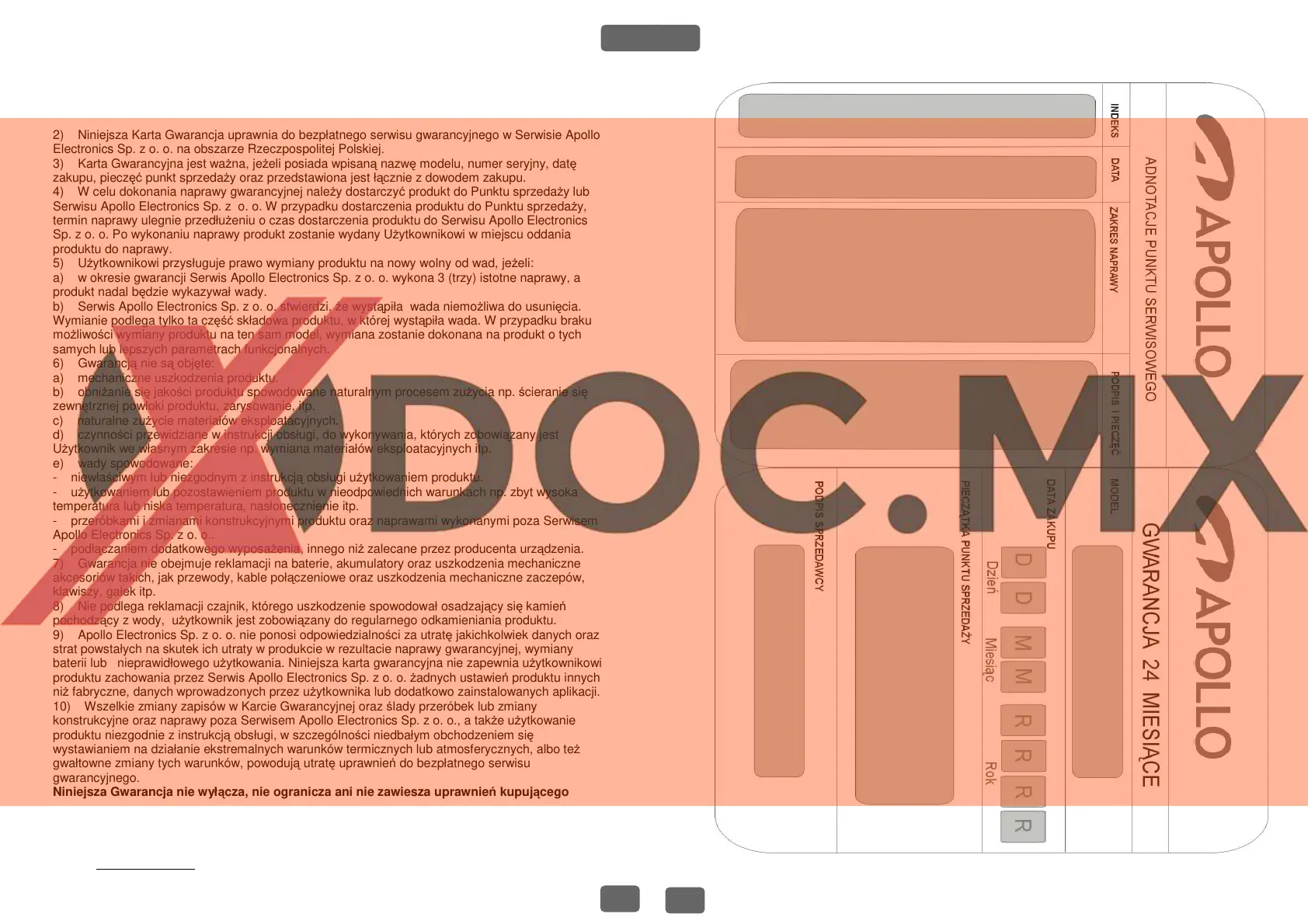 2) Niniejsza Karta Gwarancja uprawnia do bezpłatnego serwisu gwarancyjnego w Serwisie Apollo