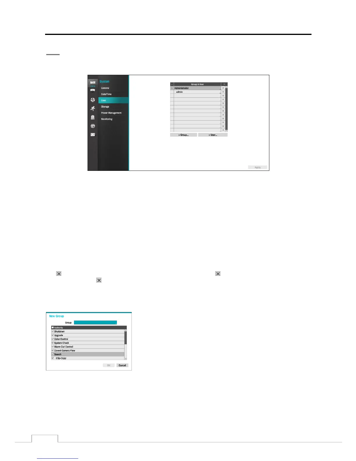 The User screen displays the authorized groups and users which can be added, deleted and modified. When adding a