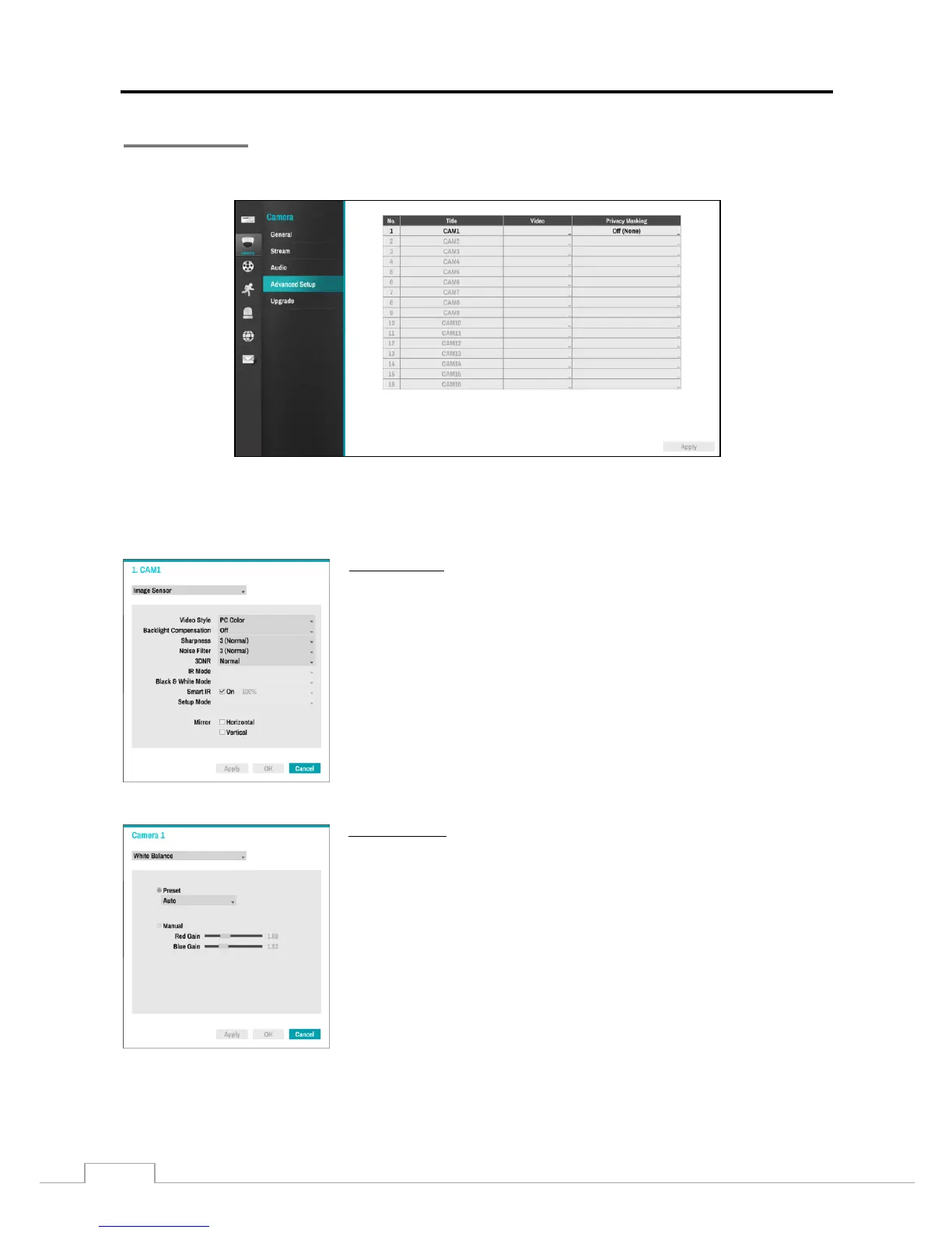 Manual: Select to adjust the white balance manually. Adjust the Red and Blue gain.
