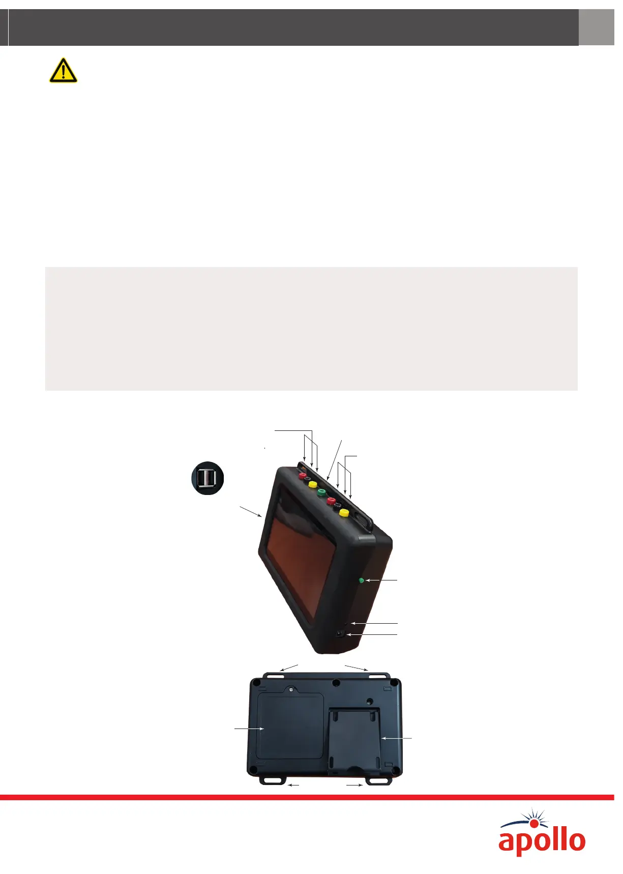 • The Apollo Test Set is designed for indoor use only and should not be subjected to harsh environments. It is not