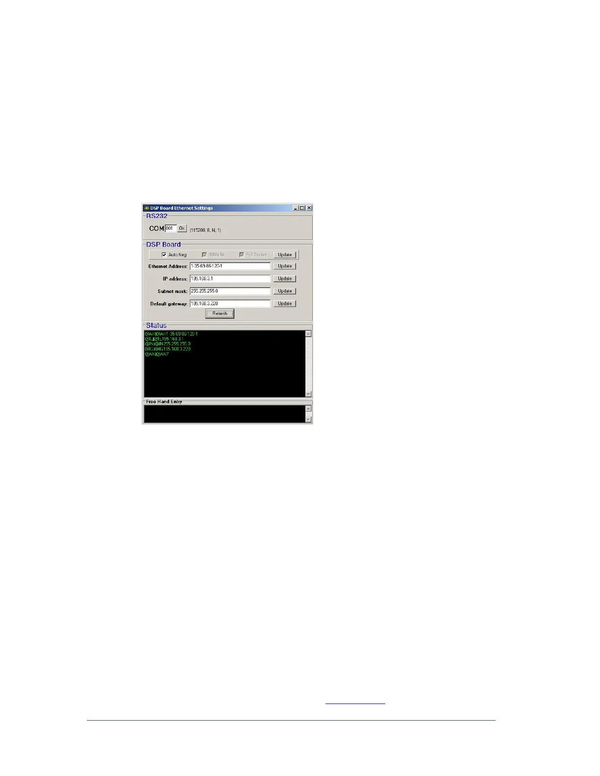 5. DSP Board check boxes; Auto Negotiate (Auto Neg), 100 Mbit, and Full Duplex. These are to