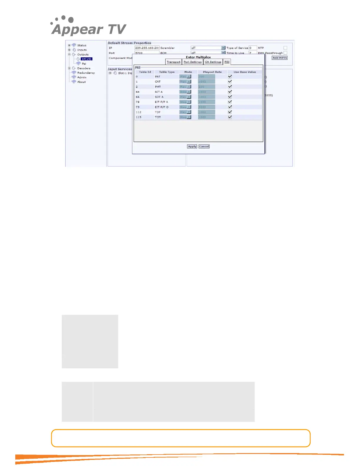 In the PSI screen, fields for the Table Id, Table Type, Mode and Playout Rate are