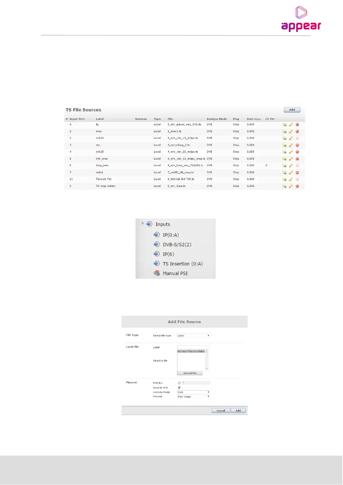 The TS insertion feature allows the upload and playout od pre-generated TS files onto any processing/output