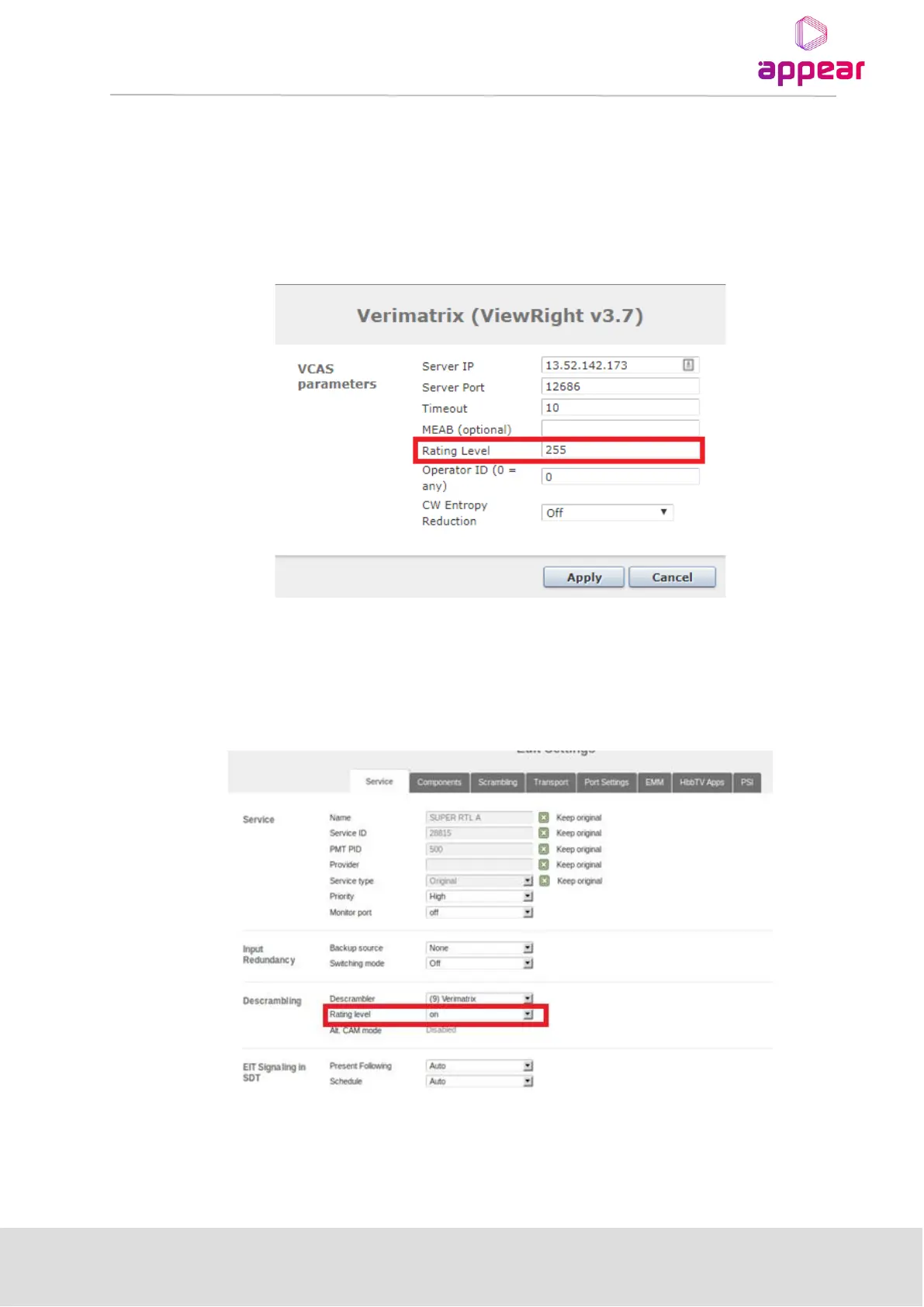 Rating level can be turn on when descrambling with Verimatrix is selected in the output GUI. This means