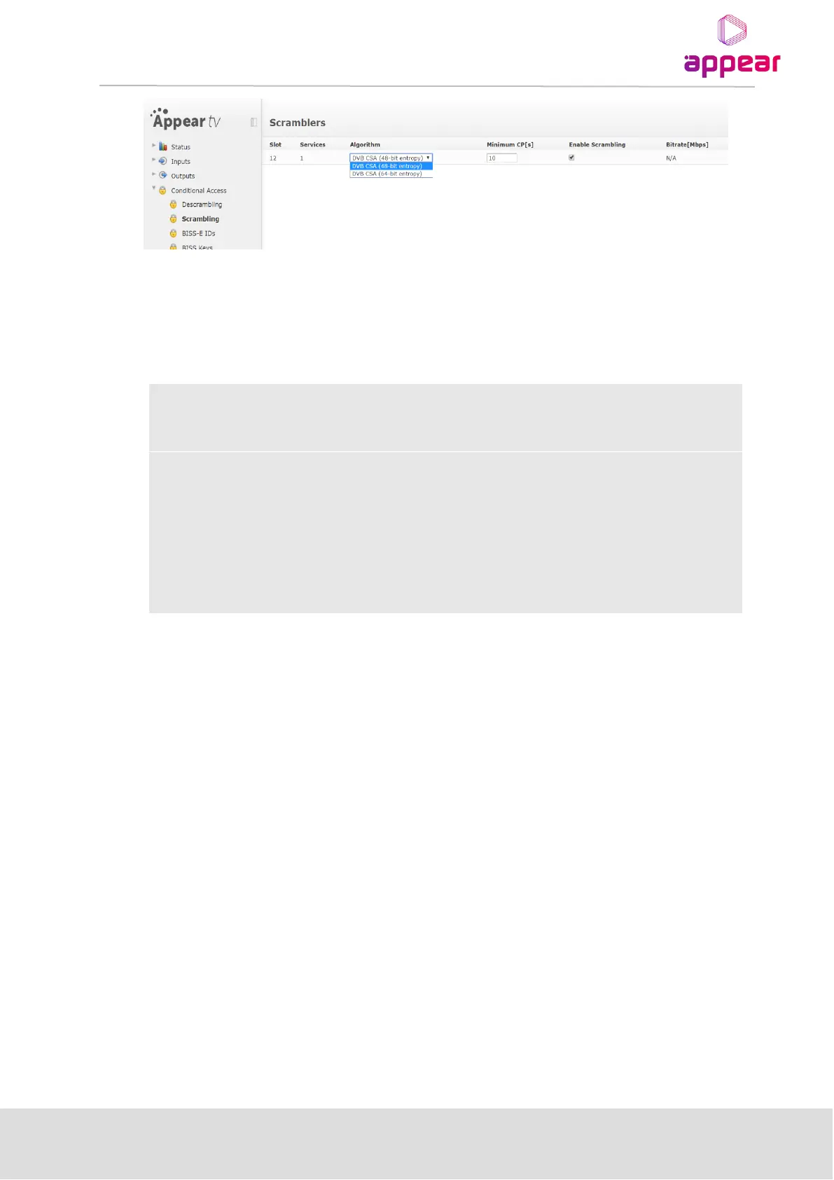 It is possible to configure a user definable minimum crypto period (CP) per scrambler card, under Conditional