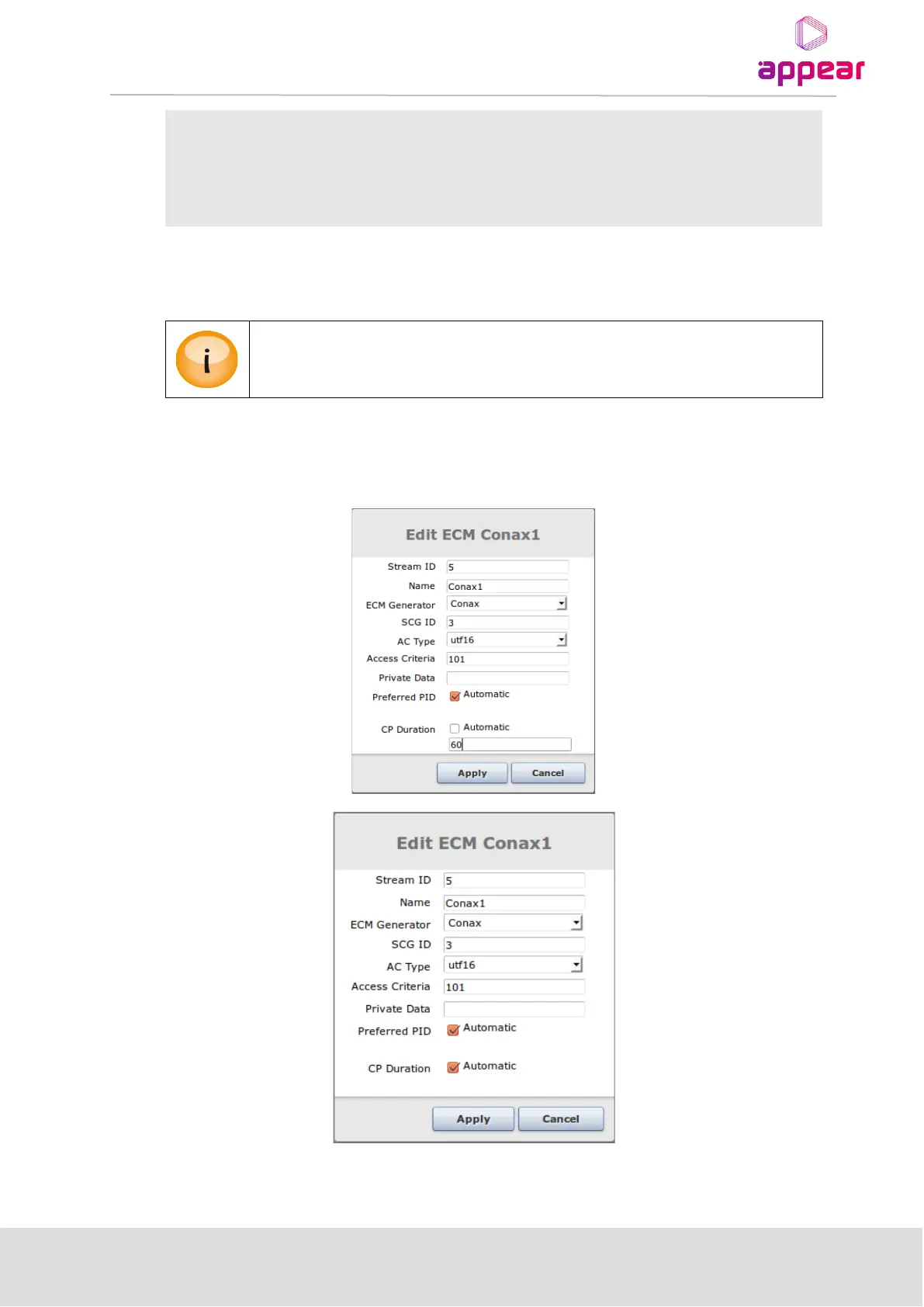 If multiple ECMG connections have been defined, the same SCG ID may be used for two ECMs as long as they are