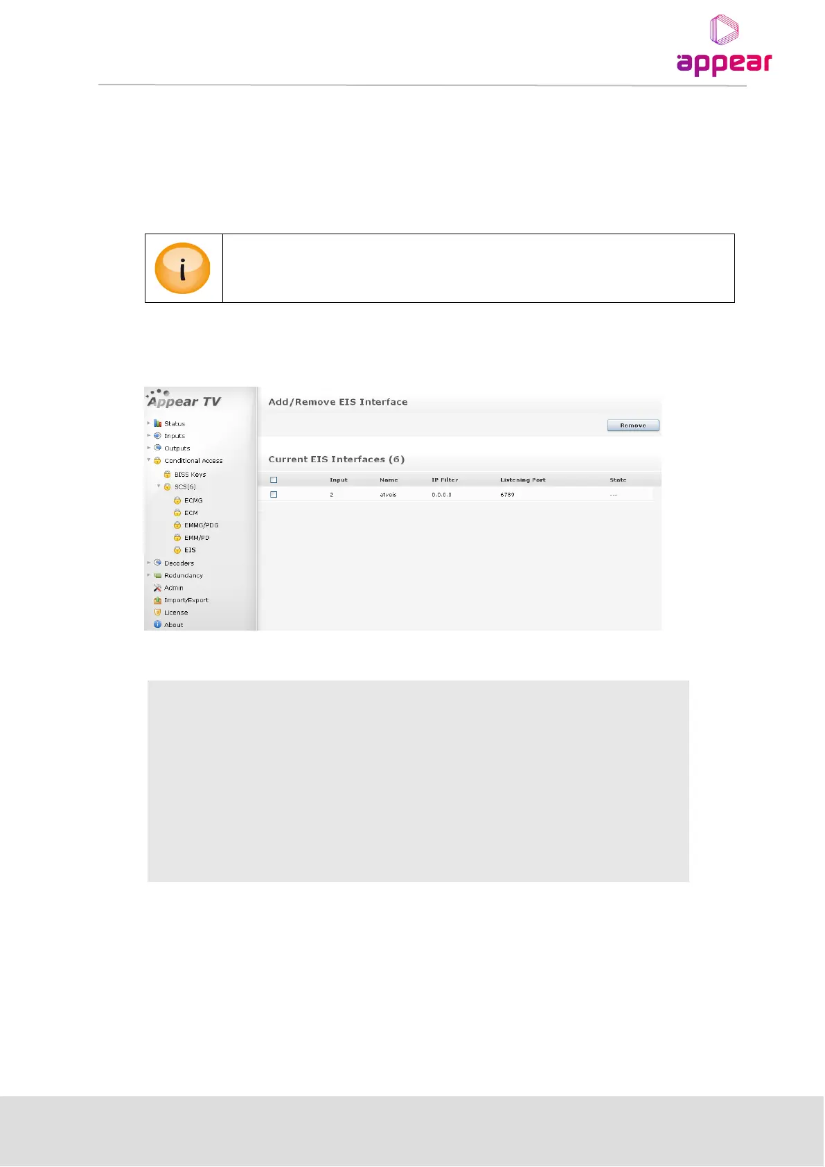 As the EIS is not able to create the ECMG channel configuration, this needs to be done from the web GUI before