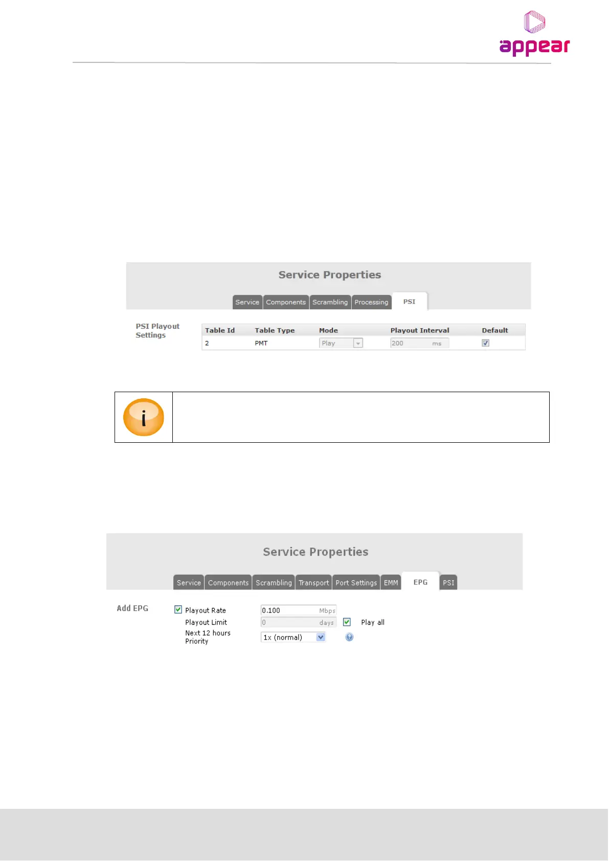 Individual services within an MPTS have a PSI tab that allows for the PMT’s Mode and Playout Interval to be