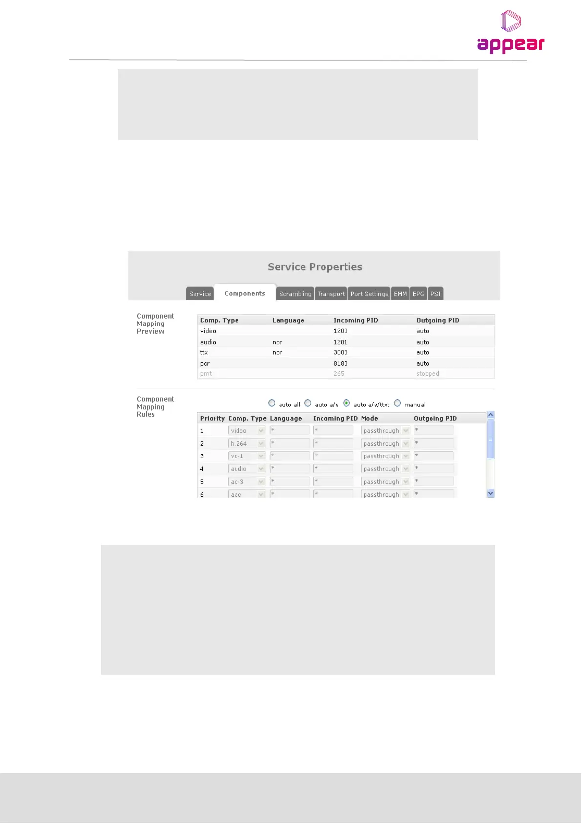 mapping includes manual and automatic modes. The Components Tab is identical for both MPTS and SPTS.