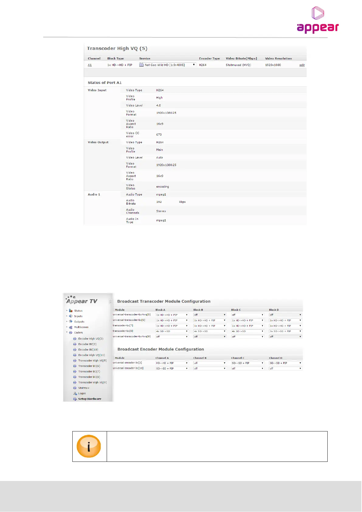 Depending on the mode of the hardware, it will be possible to configure the internal transcoder blocks (A, B, C