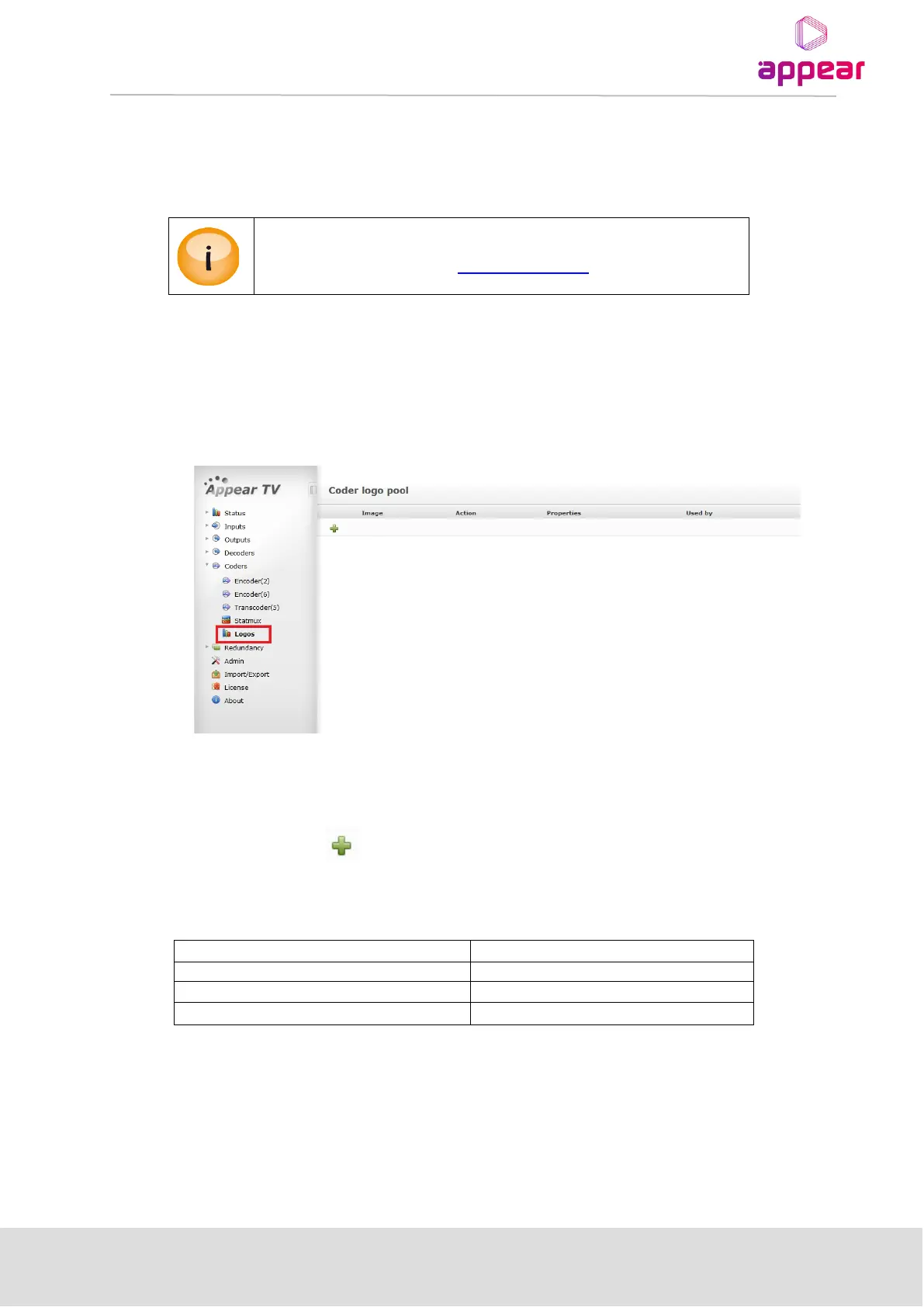 The file format supported by the Logo Insertion is 8-bit PNG with correct resolution (listed below). If the PNG file