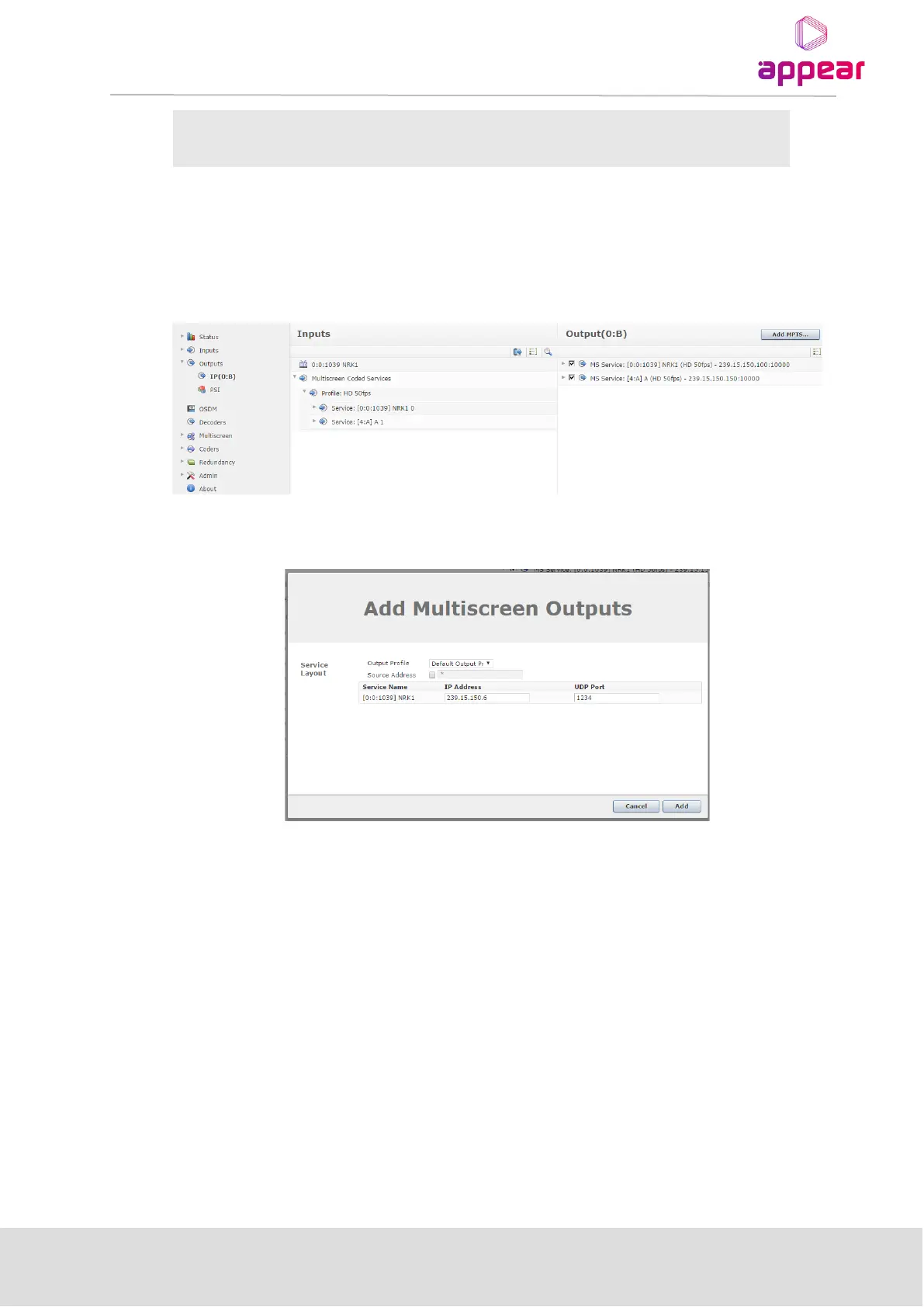 To create output multiscreen services, navigate to the ‘Outputs’ page of the required output module. On the left