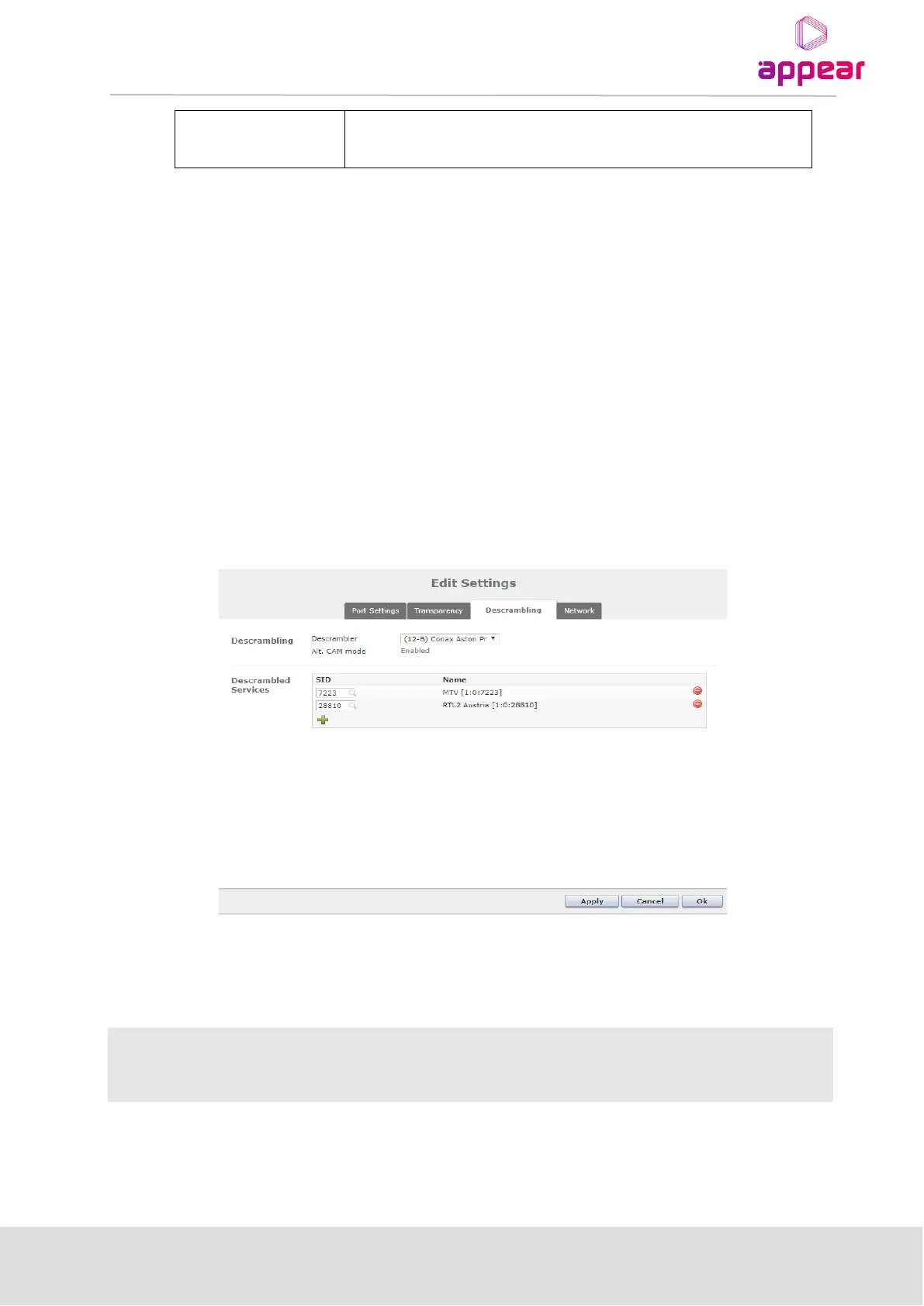 cam-b". The Descrambler supports both MUXing on the input and transparent mode, but each CAM can only be used for