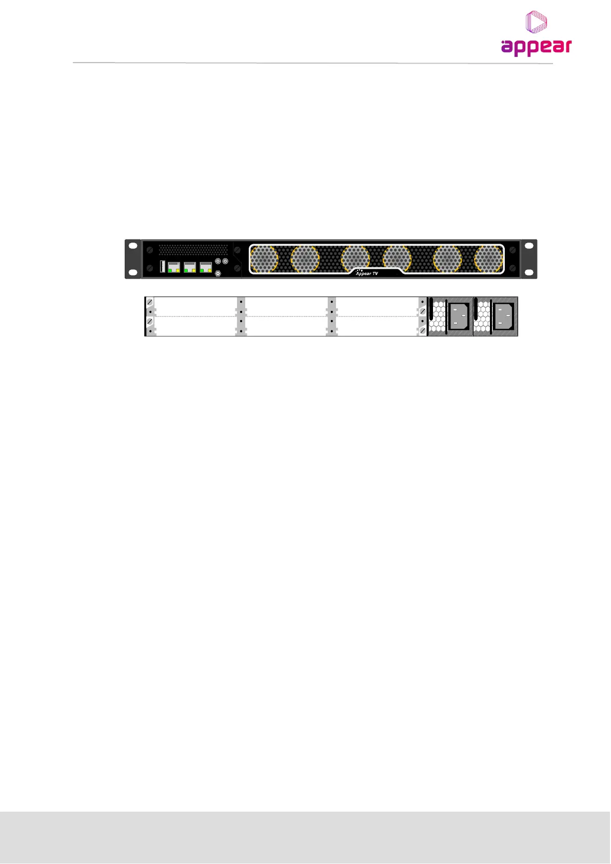 Figure 2.5 shows the front and rear view of the 1RU chassis including a mandatory switch module, power supply