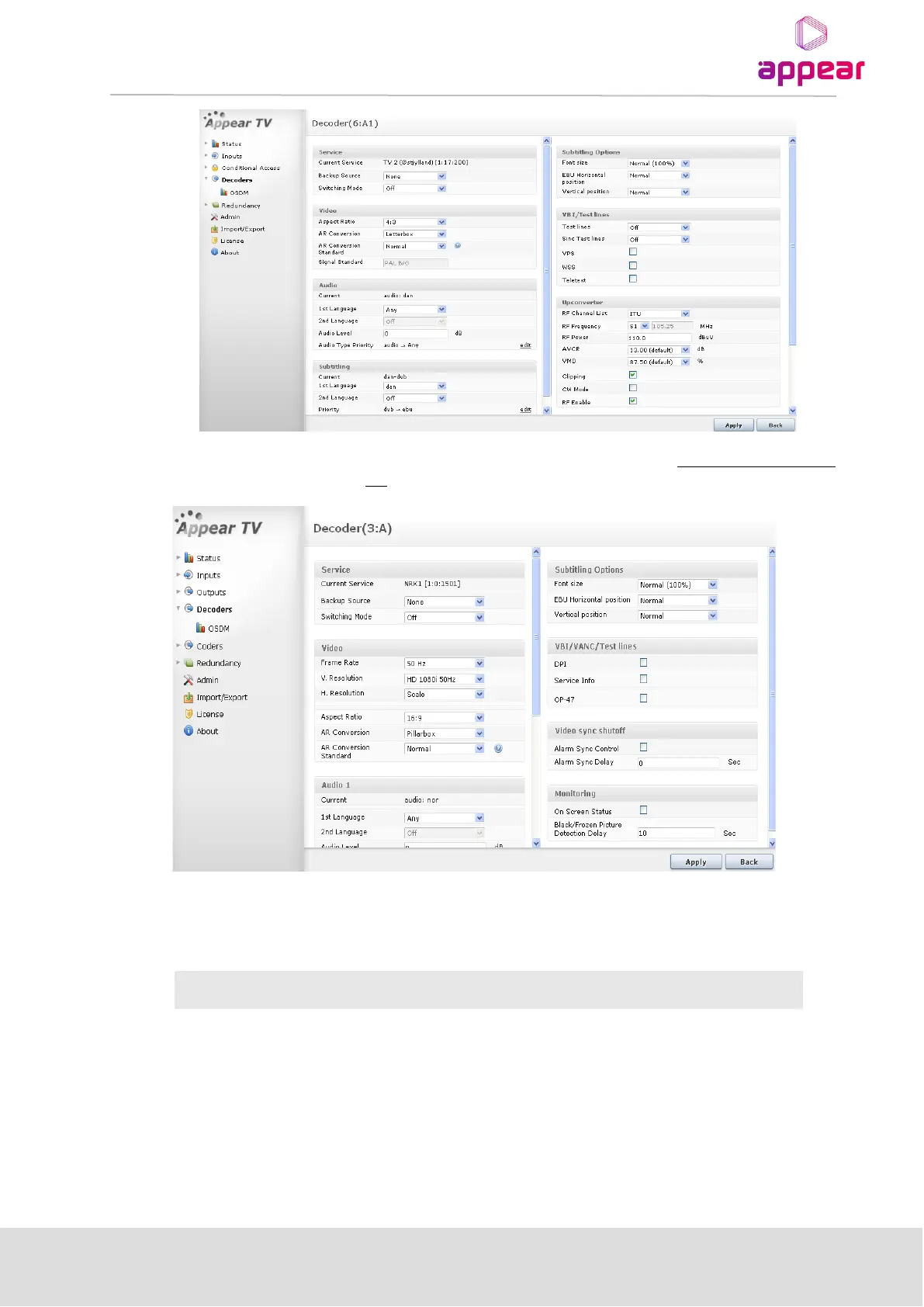 The figure above shows the configuration page for an MPEG-2/4 SD/HD Decoder with RF modulation and Stereo