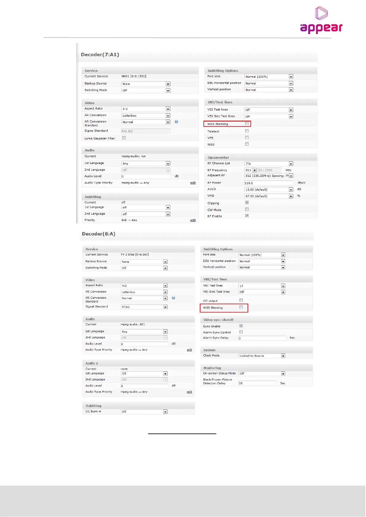 The MPEG-2/4 SD/HD Decoder with SDI and RF with NTSC signal option contains these additional parameters: